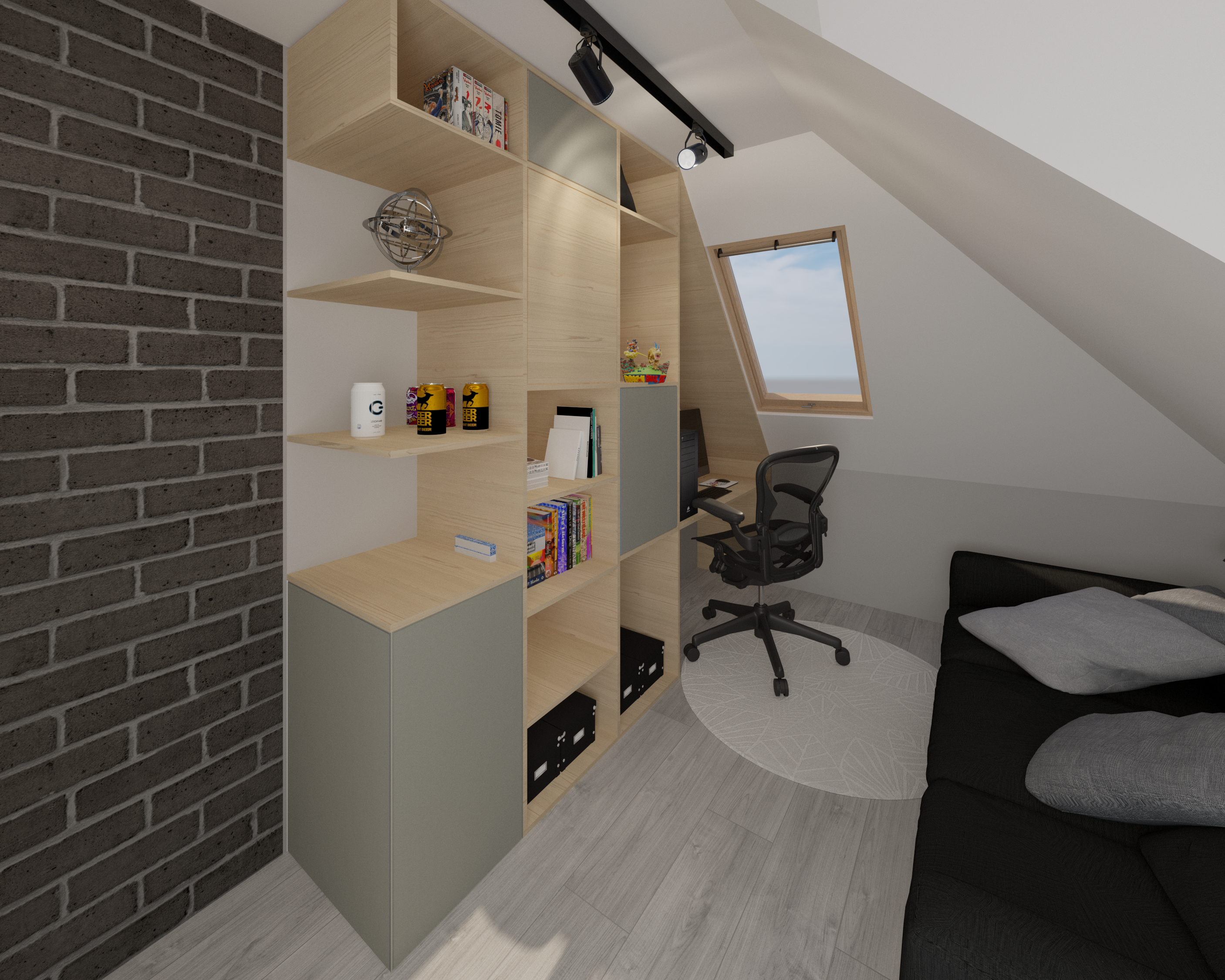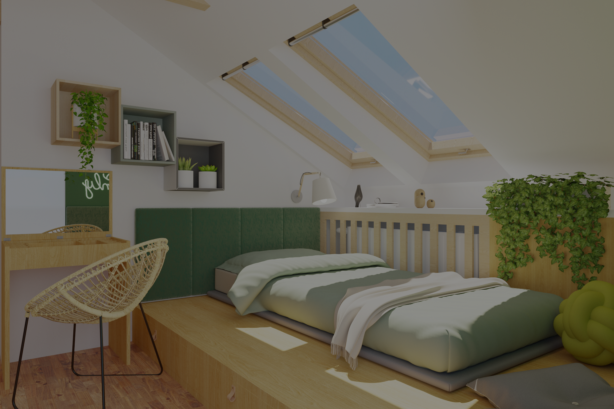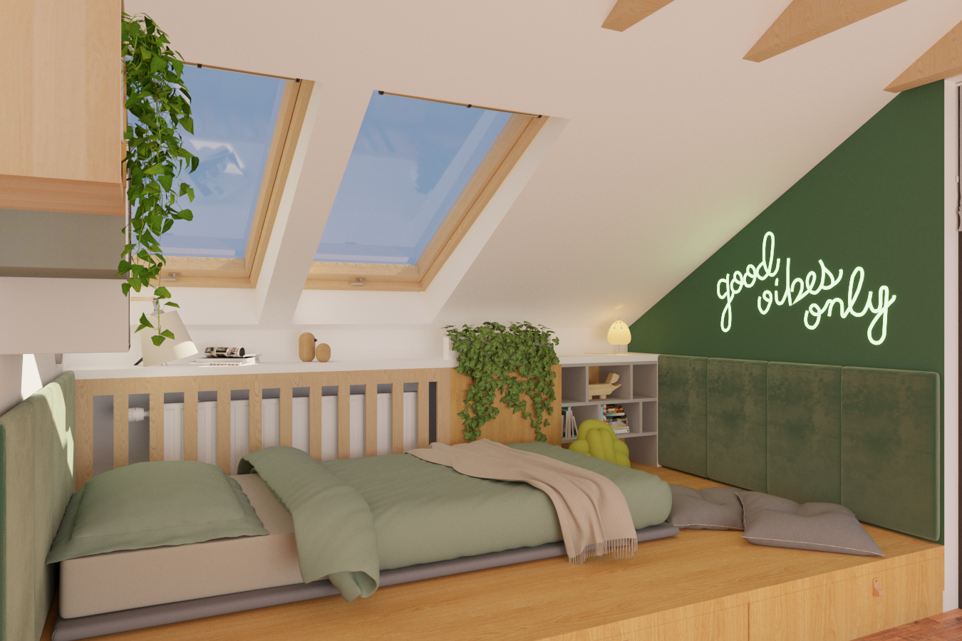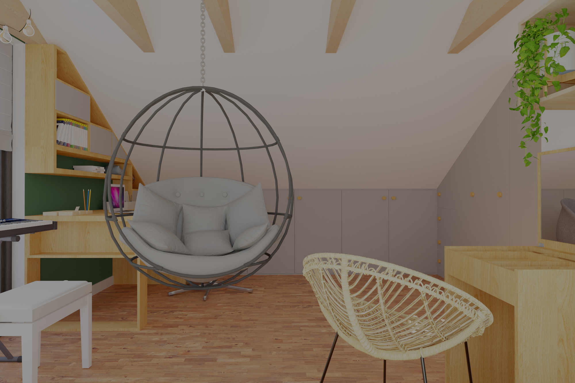 Tym razem mamy królestwo nastoletniej miłośniczki muzyki. Pod oknami dachowymi powstał drewniany podest z ogromnymi szufladami, nawiązujący do belek, na których stworzyłam części sypialnianą i wypoczynkową. Kolor zielony sprzyja relaksowi i nadaje charakteru. Znalazły się tam również półki na ulubione książki, wiszące boksy, miękki zagłówek, stylowa, regulowana lampka oraz ostatnio bardzo lubiany przez młode pokolenie neon. Przy łóżku zmieściła się mała toaletka, która jest niezbędna młodej kobiecie. Otwarte półki pod skosami zostały zamknięte gładkimi frontami w kolorze szarości ze skórzanymi uchwytami. Przy oknie tarasowym powstał kącik muzyczny. Część wypoczynkową od części przeznaczonej do nauki i pracy oddziela nam szary wiklinowy kosz, w którym można zatopić się, słuchając muzyki. Pod wysokim skosem znalazło swoje miejsce drewniane biurko z nadstawką, która pomieści wszystkie niezbędne przybory i książki. Na drewnianej belce zawisną girlandy świetlne, tworząc niesamowity nastrój wieczorową porą.
