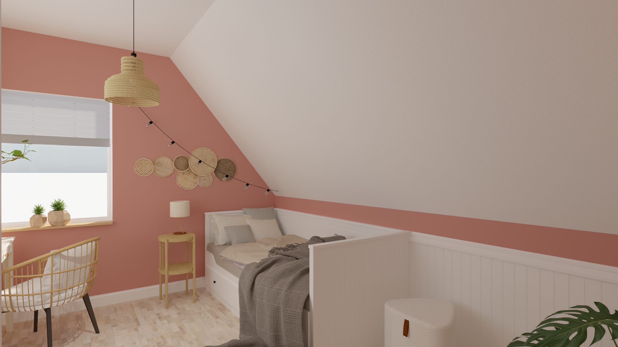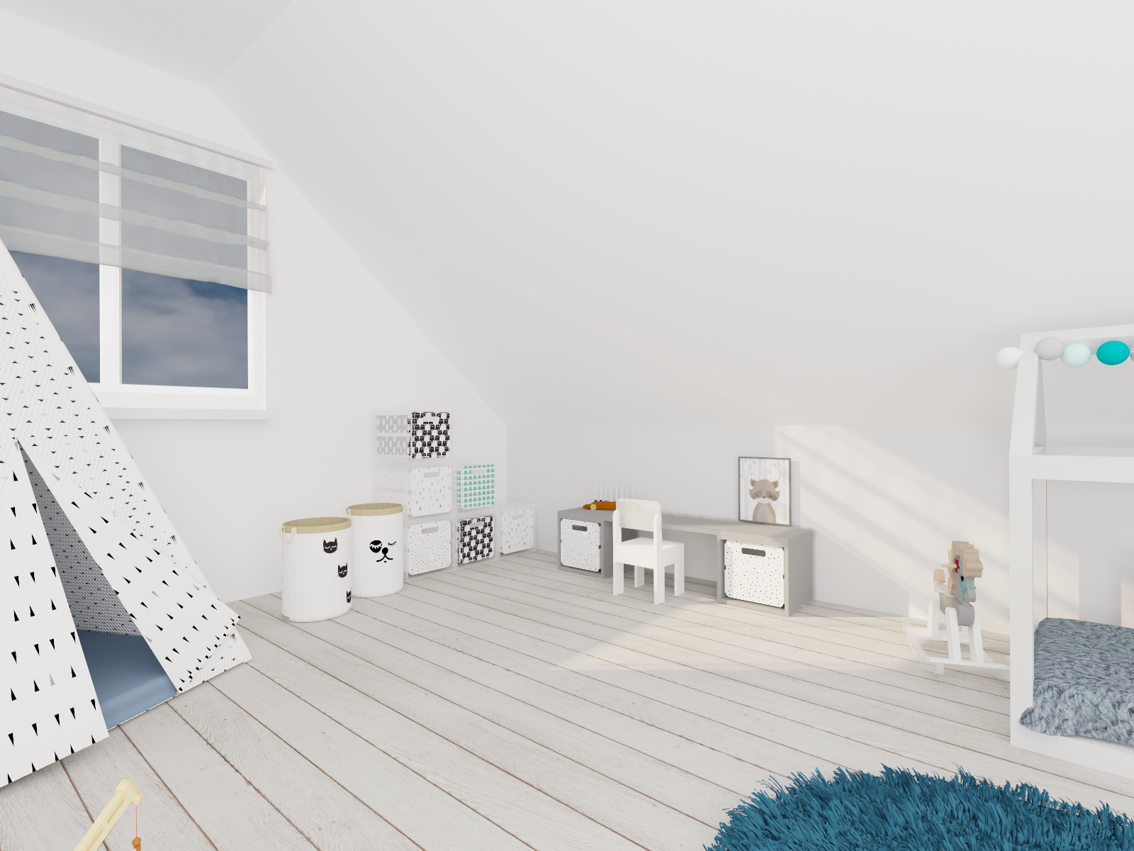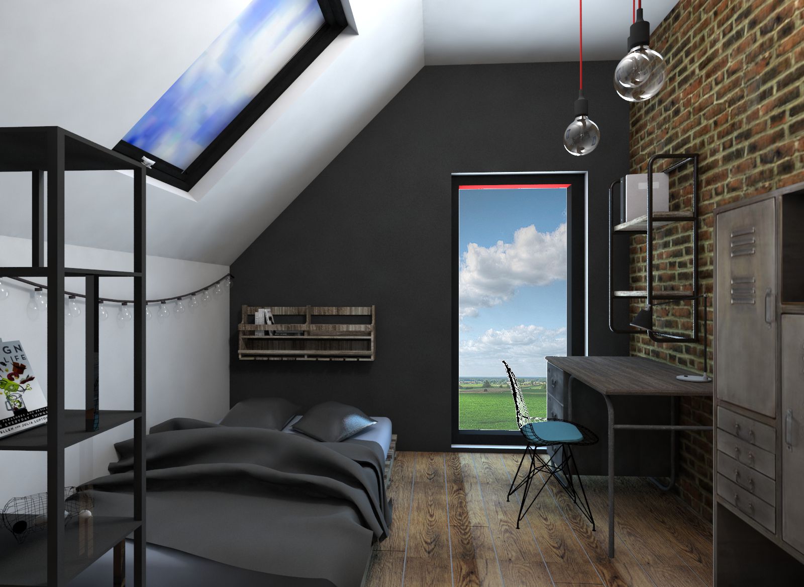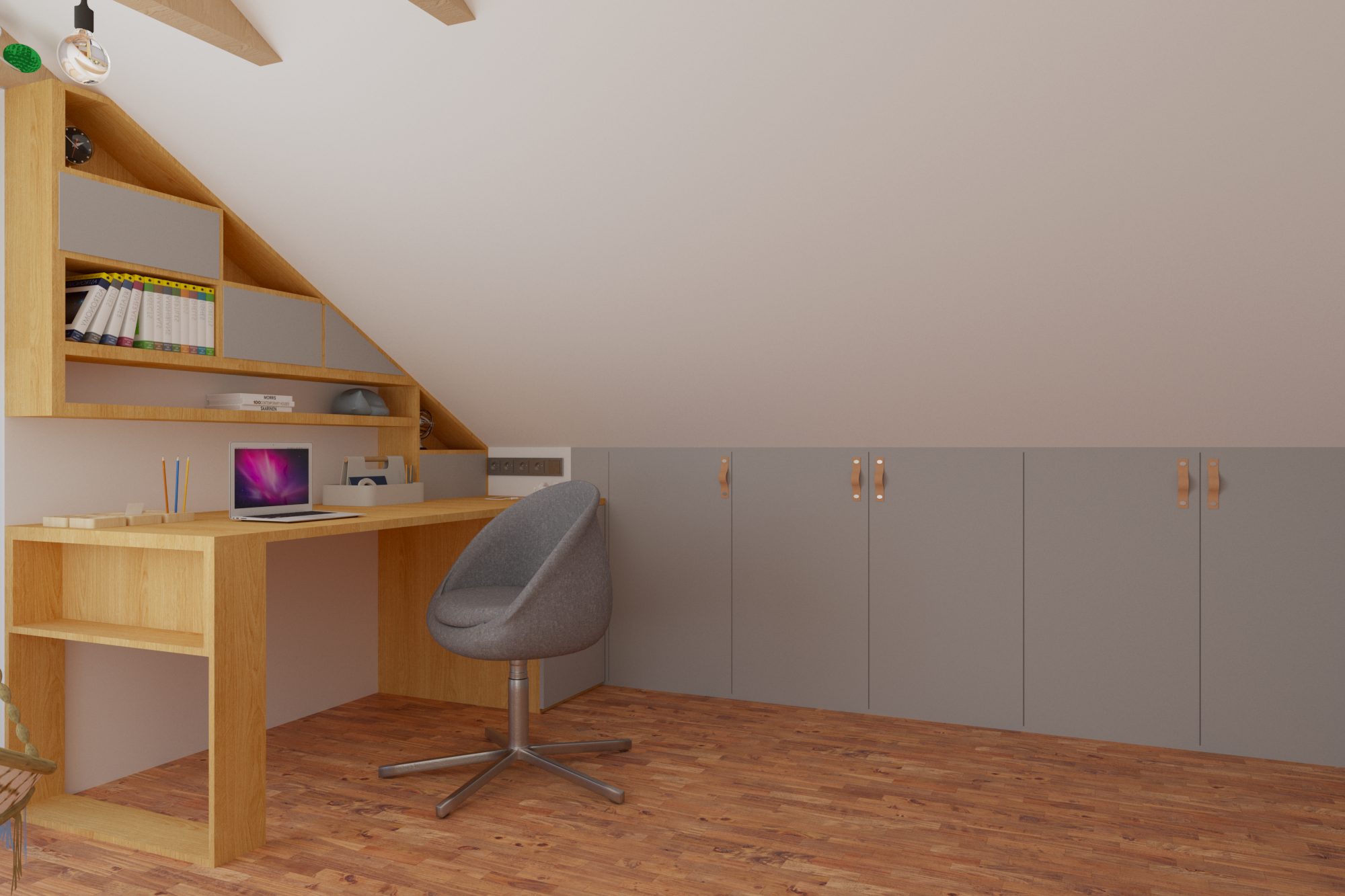Tym razem mamy królestwo nastoletniej miłośniczki muzyki. Pod oknami dachowymi powstał drewniany podest z ogromnymi szufladami, nawiązujący do belek, na których stworzyłam części sypialnianą i wypoczynkową. Kolor zielony sprzyja relaksowi i nadaje charakteru. Znalazły się tam również półki na ulubione książki, wiszące boksy, miękki zagłówek, stylowa, regulowana lampka oraz ostatnio bardzo lubiany przez młode pokolenie neon. Przy łóżku zmieściła się mała toaletka, która jest niezbędna młodej kobiecie. Otwarte półki pod skosami zostały zamknięte gładkimi frontami w kolorze szarości ze skórzanymi uchwytami. Przy oknie tarasowym powstał kącik muzyczny. Część wypoczynkową od części przeznaczonej do nauki i pracy oddziela nam szary wiklinowy kosz, w którym można zatopić się, słuchając muzyki. Pod wysokim skosem znalazło swoje miejsce drewniane biurko z nadstawką, która pomieści wszystkie niezbędne przybory i książki. Na drewnianej belce zawisną girlandy świetlne, tworząc niesamowity nastrój wieczorową porą.