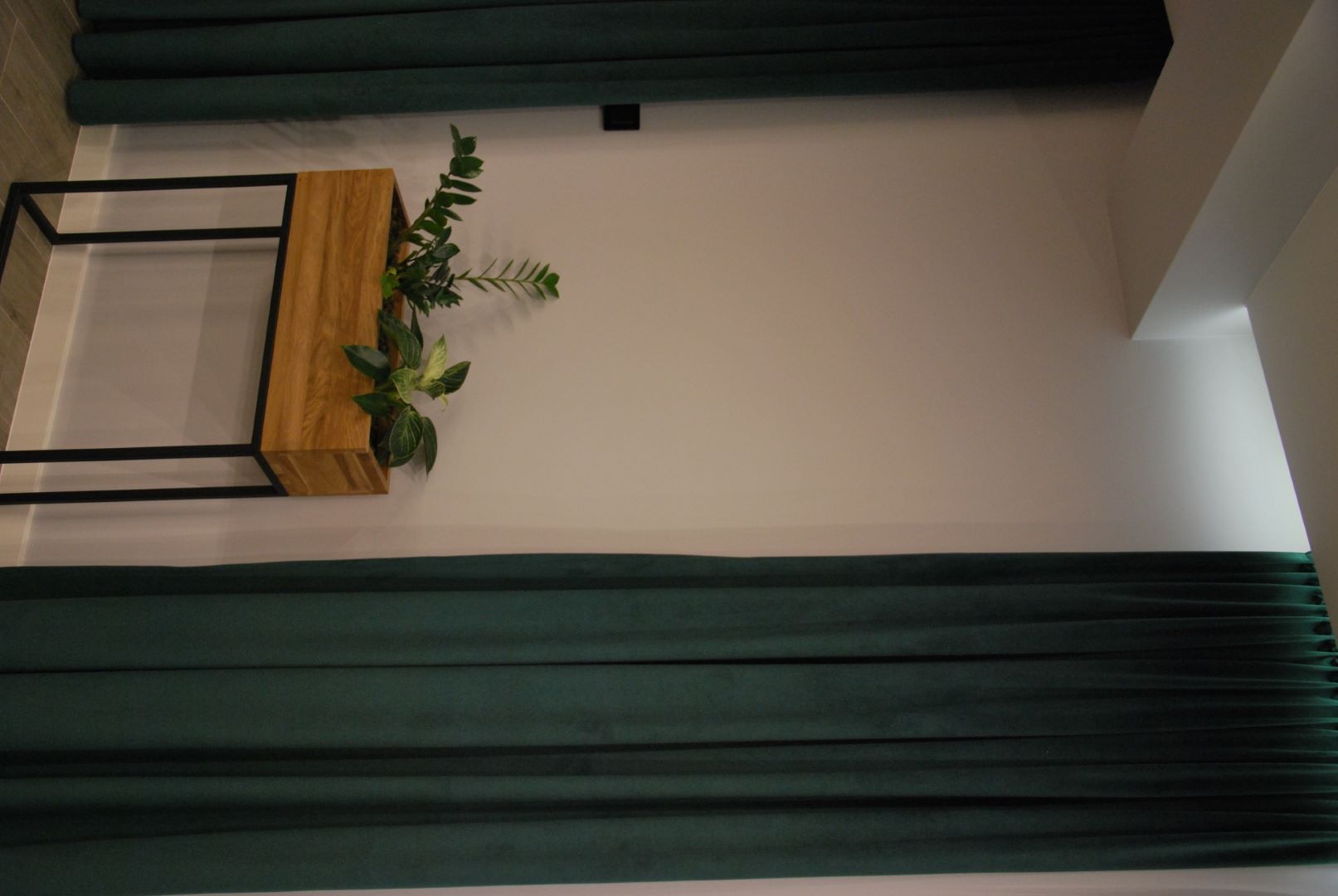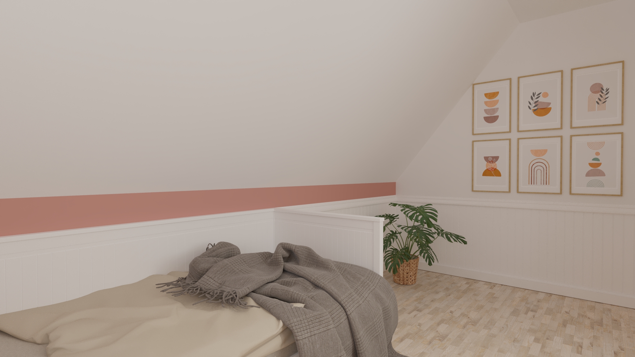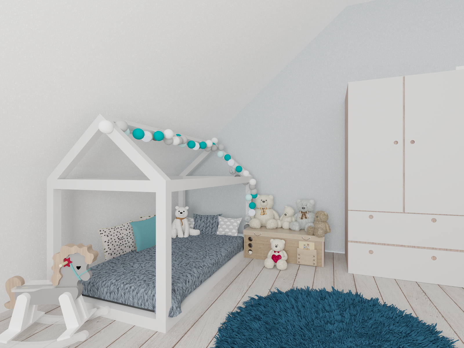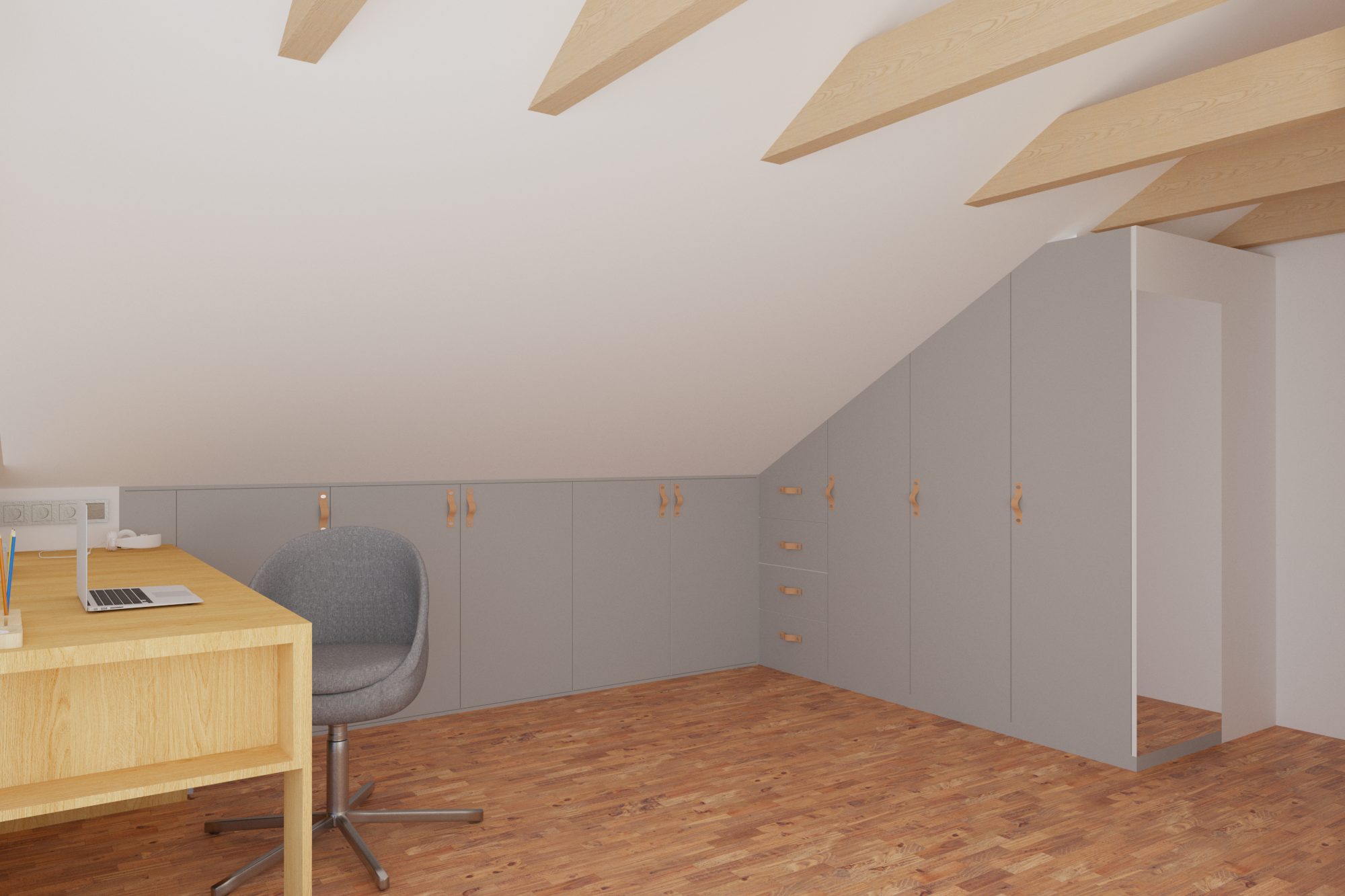 Tym razem mamy królestwo nastoletniej miłośniczki muzyki. Pod oknami dachowymi powstał drewniany podest z ogromnymi szufladami, nawiązujący do belek, na których stworzyłam części sypialnianą i wypoczynkową. Kolor zielony sprzyja relaksowi i nadaje charakteru. Znalazły się tam również półki na ulubione książki, wiszące boksy, miękki zagłówek, stylowa, regulowana lampka oraz ostatnio bardzo lubiany przez młode pokolenie neon. Przy łóżku zmieściła się mała toaletka, która jest niezbędna młodej kobiecie. Otwarte półki pod skosami zostały zamknięte gładkimi frontami w kolorze szarości ze skórzanymi uchwytami. Przy oknie tarasowym powstał kącik muzyczny. Część wypoczynkową od części przeznaczonej do nauki i pracy oddziela nam szary wiklinowy kosz, w którym można zatopić się, słuchając muzyki. Pod wysokim skosem znalazło swoje miejsce drewniane biurko z nadstawką, która pomieści wszystkie niezbędne przybory i książki. Na drewnianej belce zawisną girlandy świetlne, tworząc niesamowity nastrój wieczorową porą.