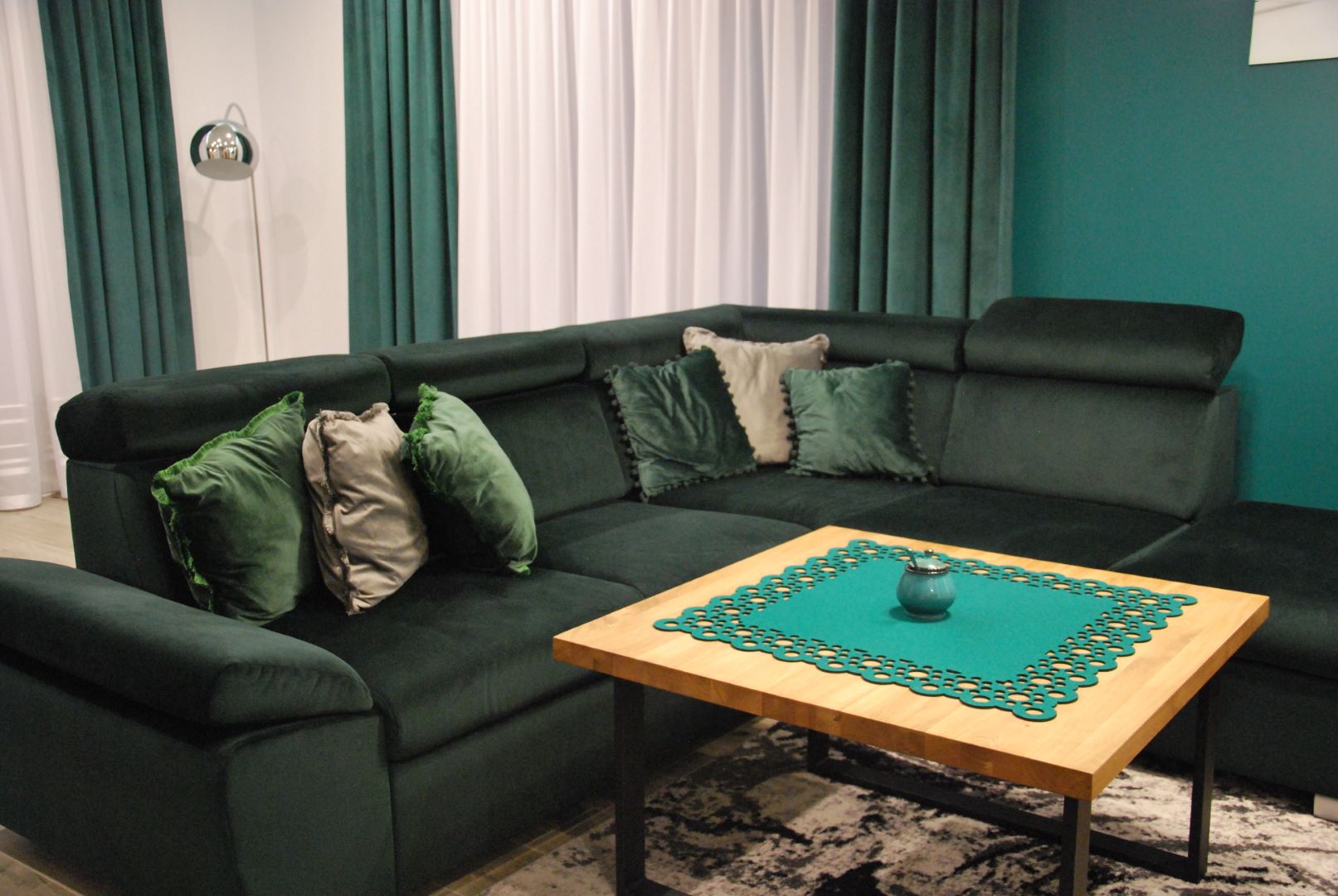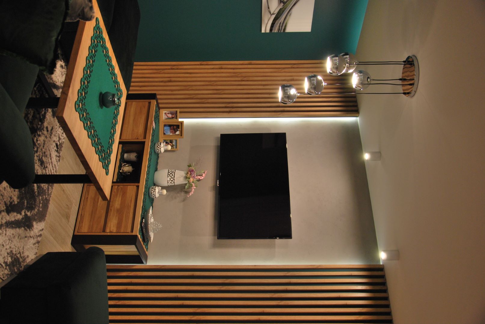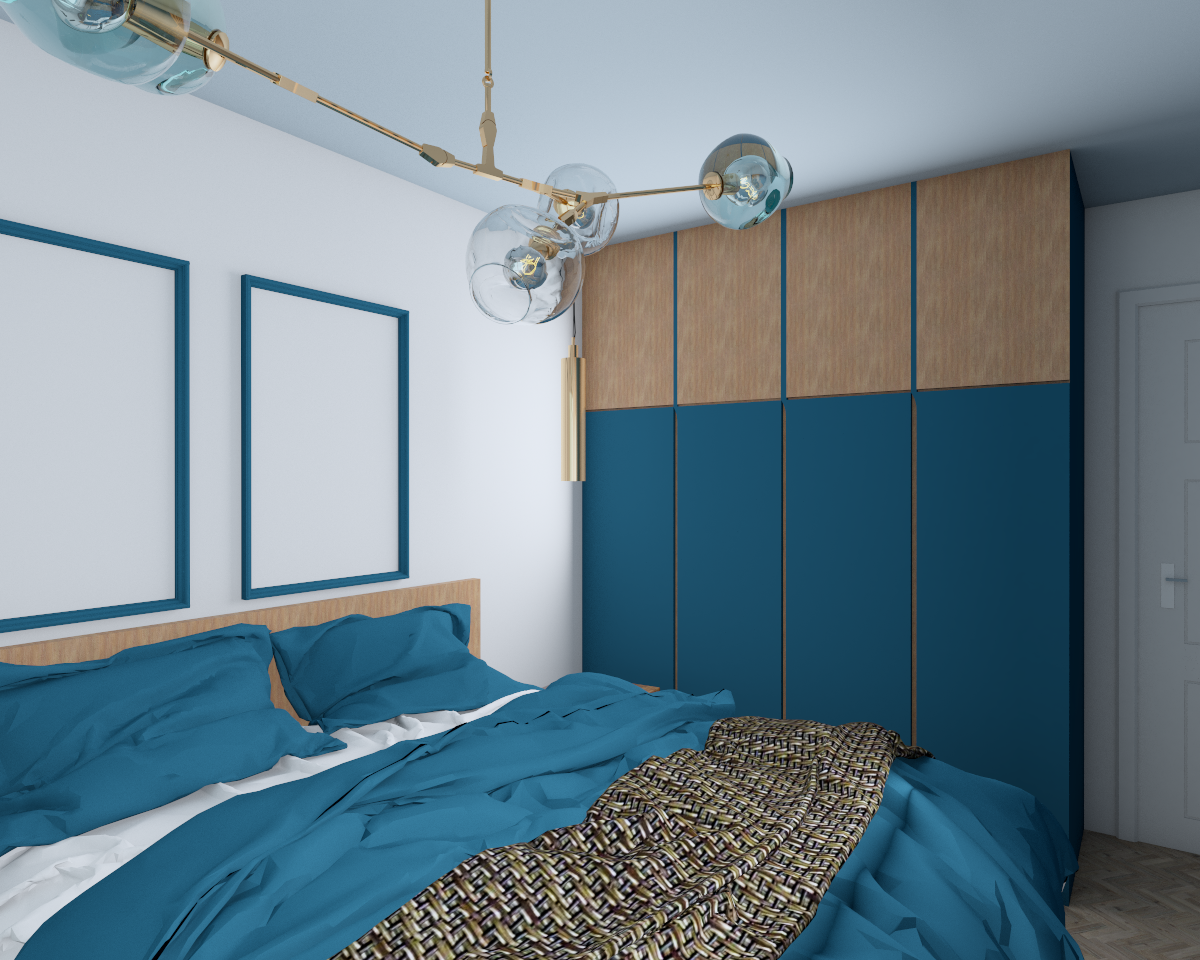 Mieszkanie inwestycyjne zaprojektowane z myślą, by każdy czuł się w nim dobrze. Ciepłe kolory drewna w każdym pomieszczeniu i lamele za stołem w jadalni sprawiły, że mieszkanie stało się przytulne. Mocne turkusowe akcenty, którymi została wykończona ściana w salonie oraz łazience, nadają wnętrzu charakteru. Elegancji w salonie dodaje sztukateria w kolorze ściany.