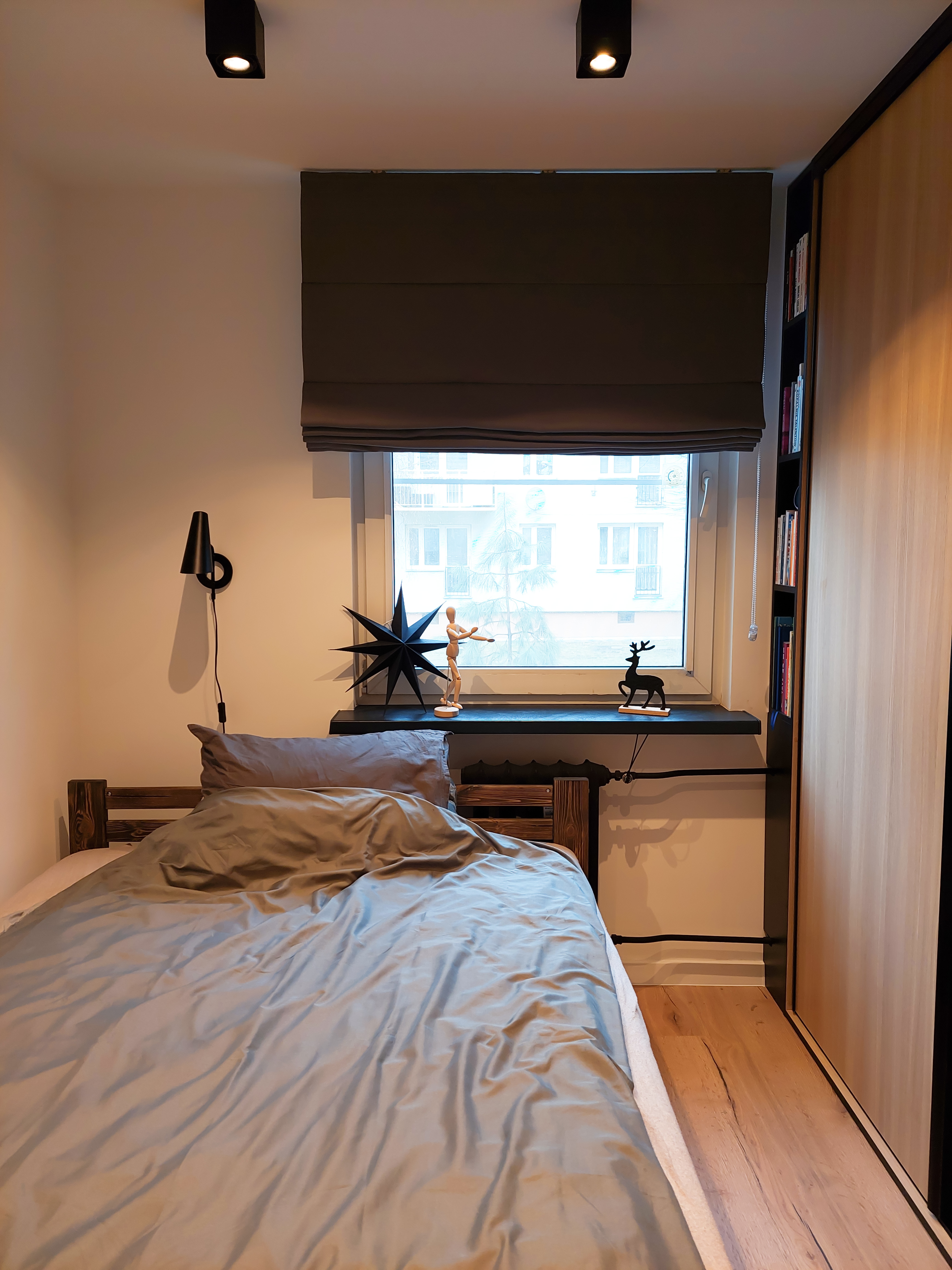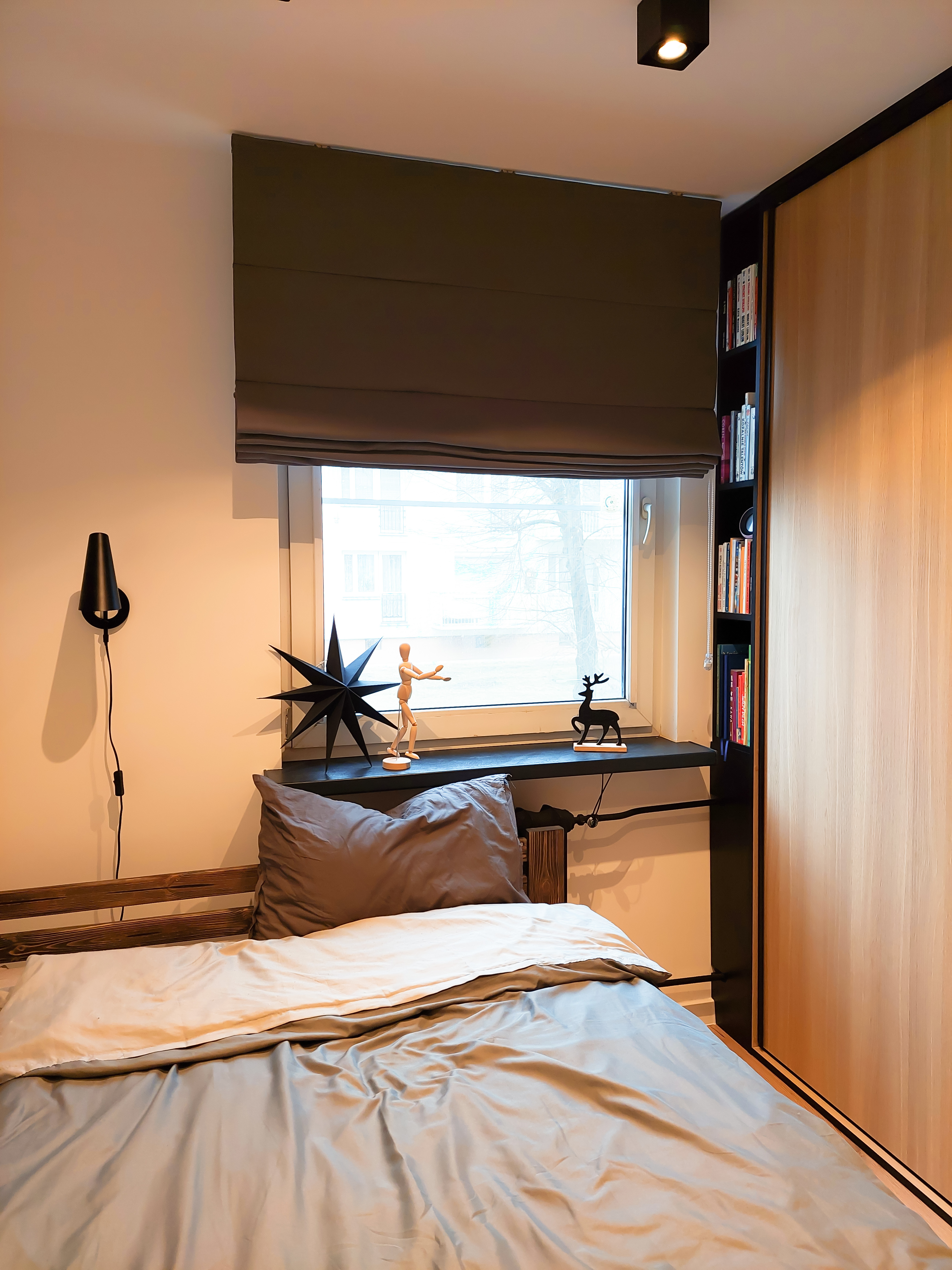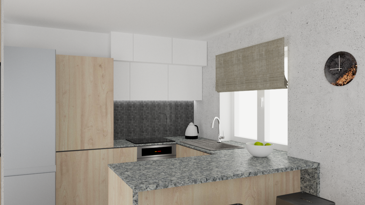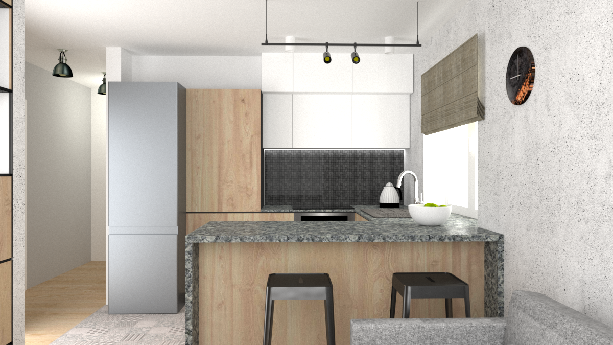 Inwestorka zdecydowała się na wyburzenie ścian działowych pomiędzy kuchnia i salonem. Dzięki temu uzyskała otwartą przestrzeń, łączącą kuchnie, salon i wydzieloną w salonie sypialnię. Strefa sypialni została oddzielona ażurowym regałem na wymiar, który jest prosty, ale doskonale spełnia funkcję dekoracyjną i funkcjonalną.