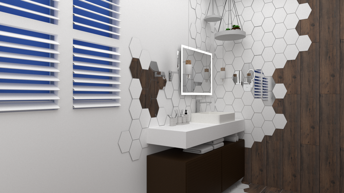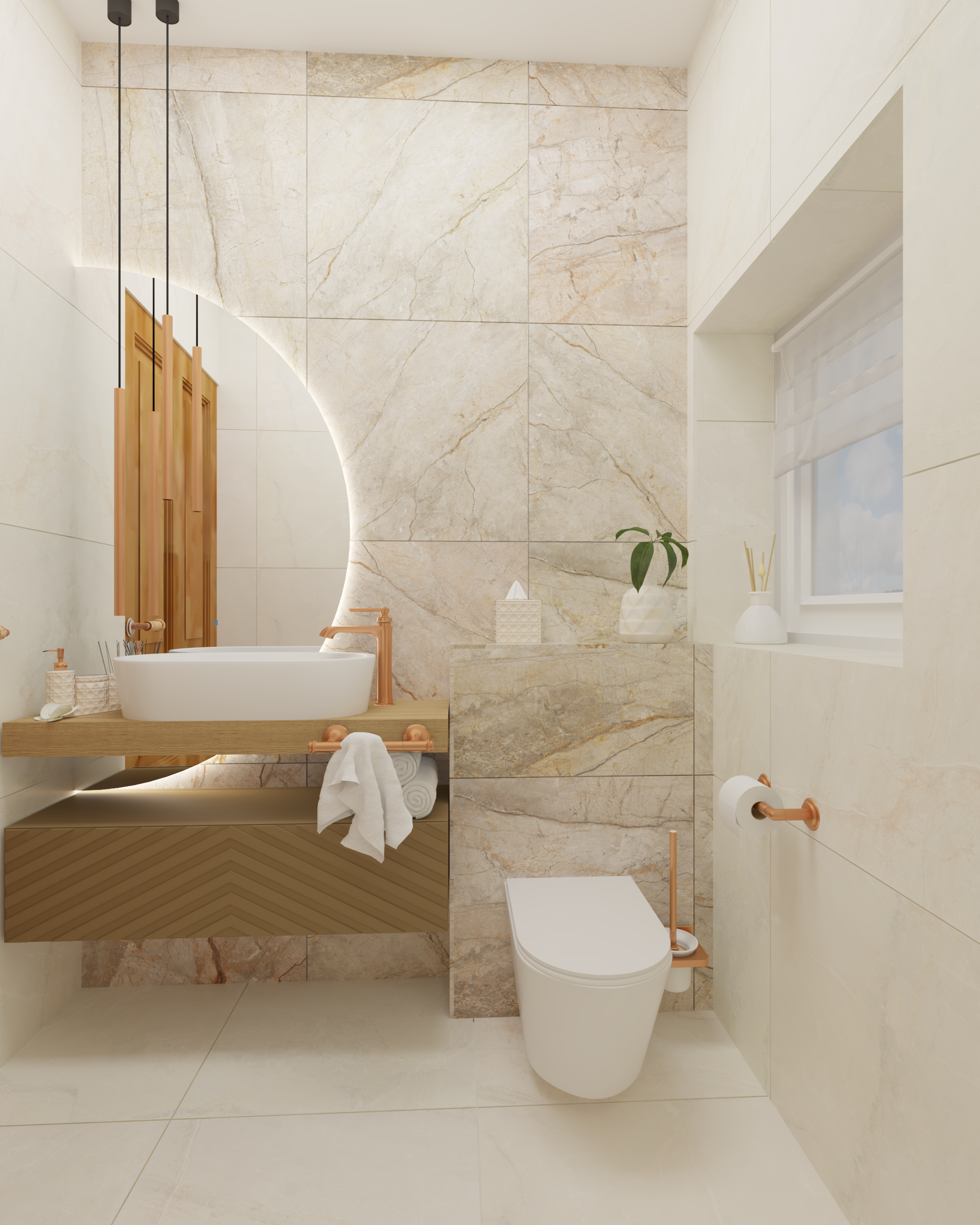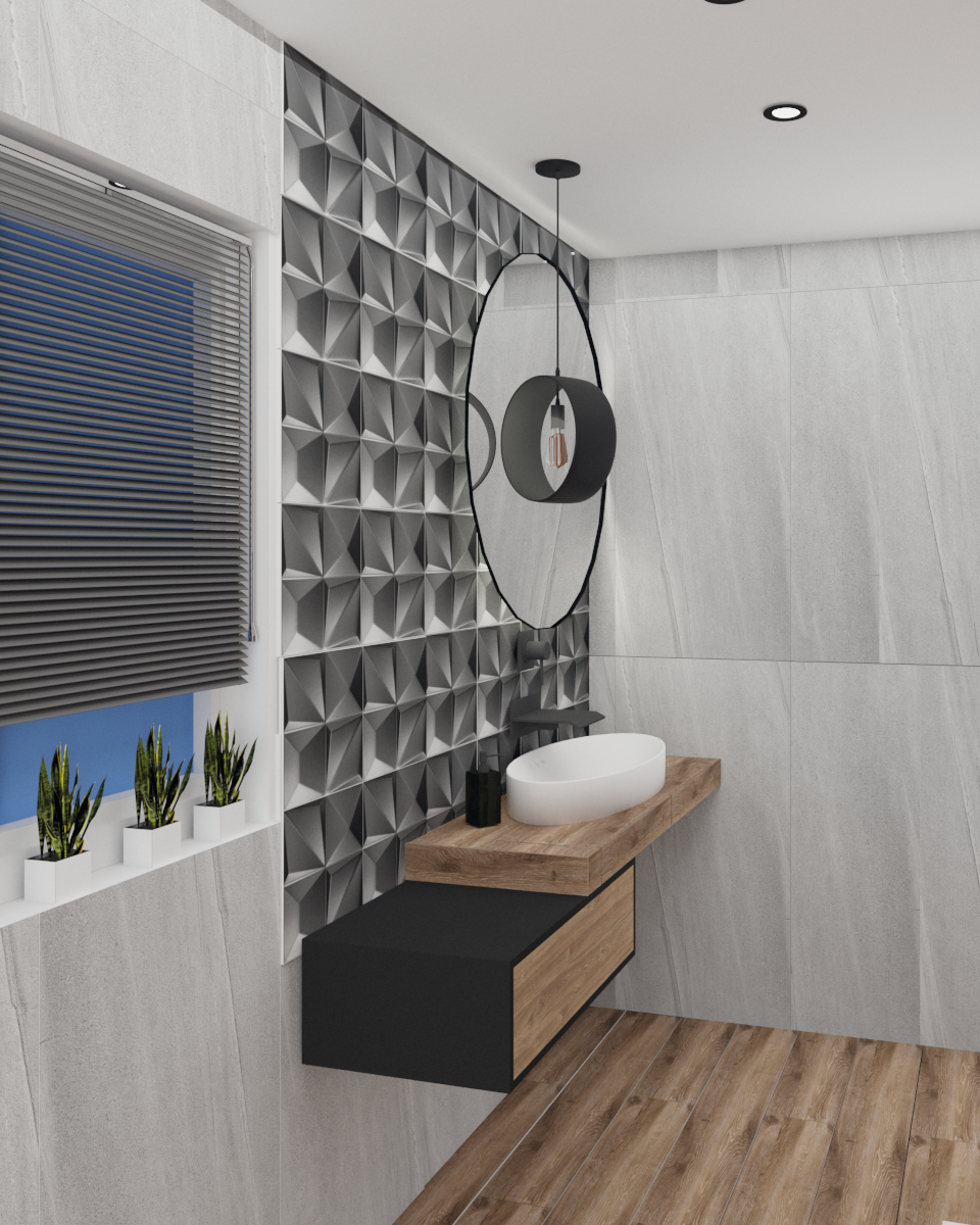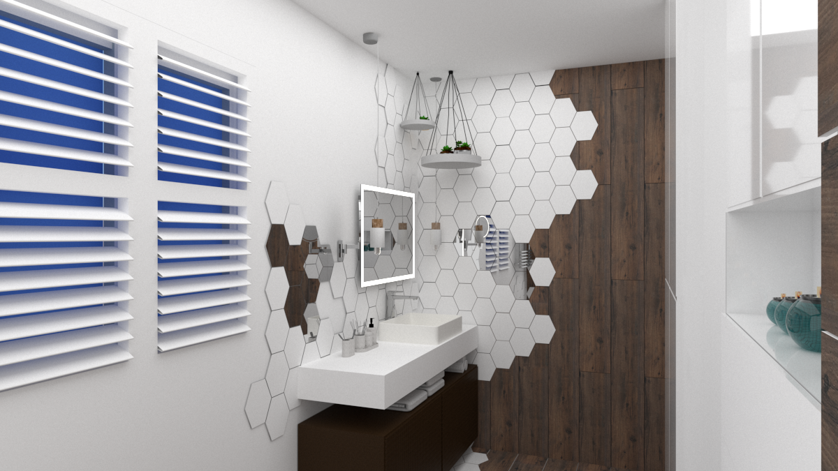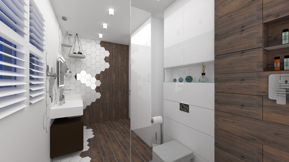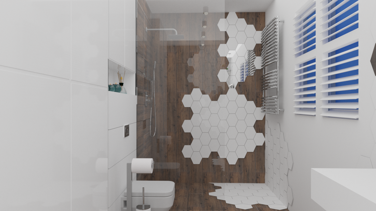 Łazienka z marmurowymi płytkami w bloku