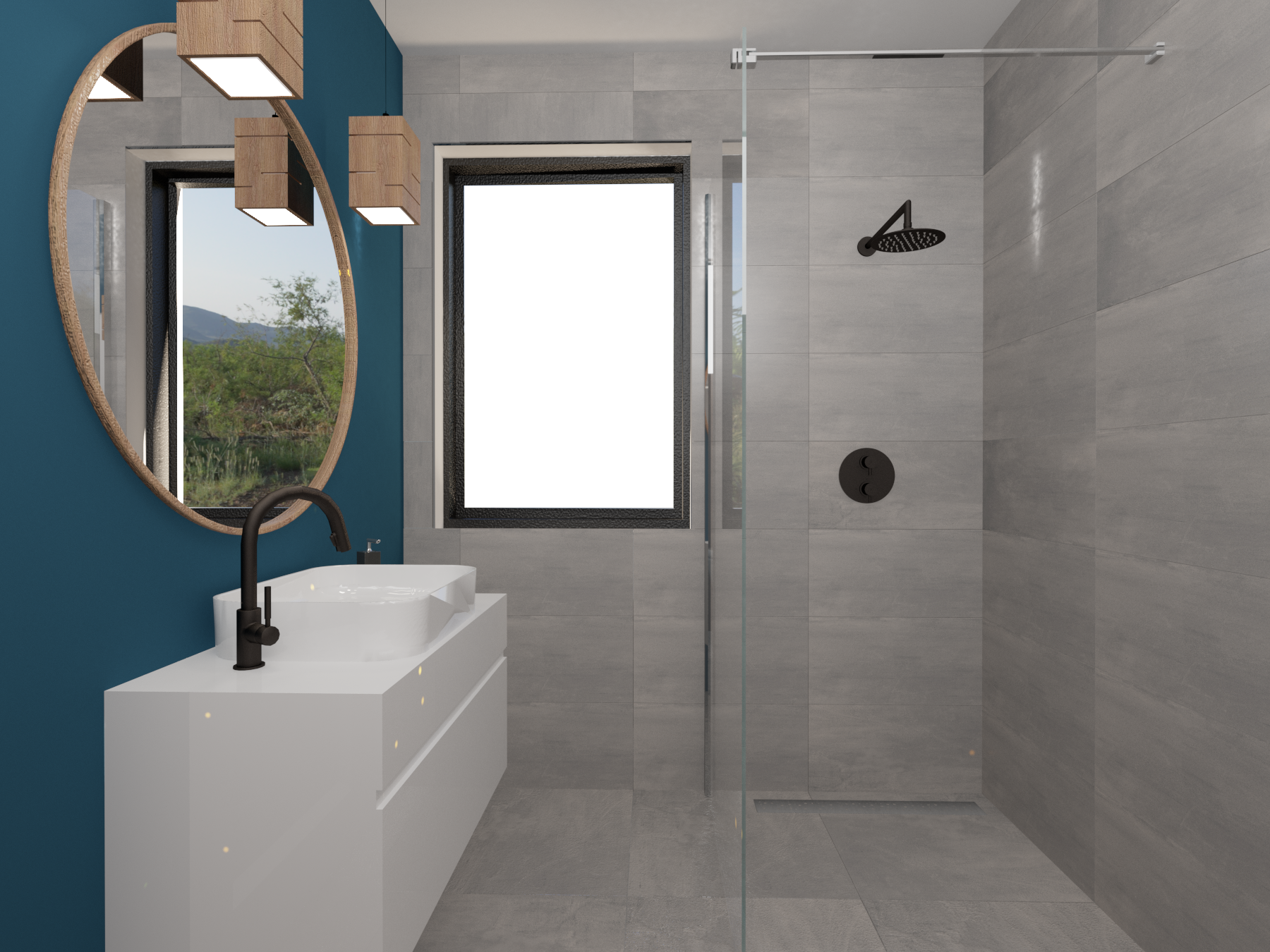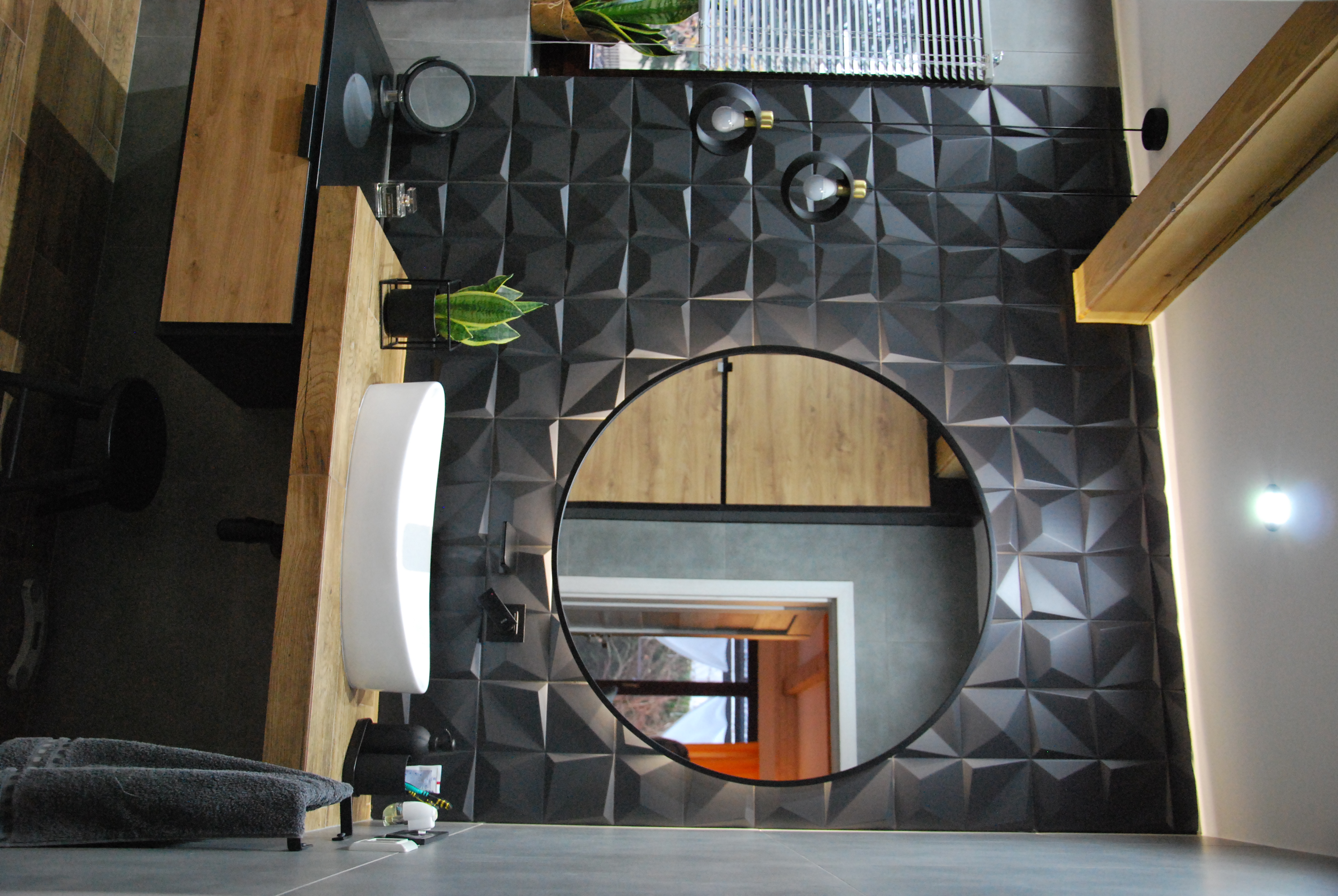 Płyty wielkoformatowe imitujące kamień w kolorze turkusu z brązowymi żyłami tworzą niesamowity klimat sprzyjający relaksowi w wannie wolnostojącej. Złote dodatki natomiast dodają elegancji i wyrafinowania.