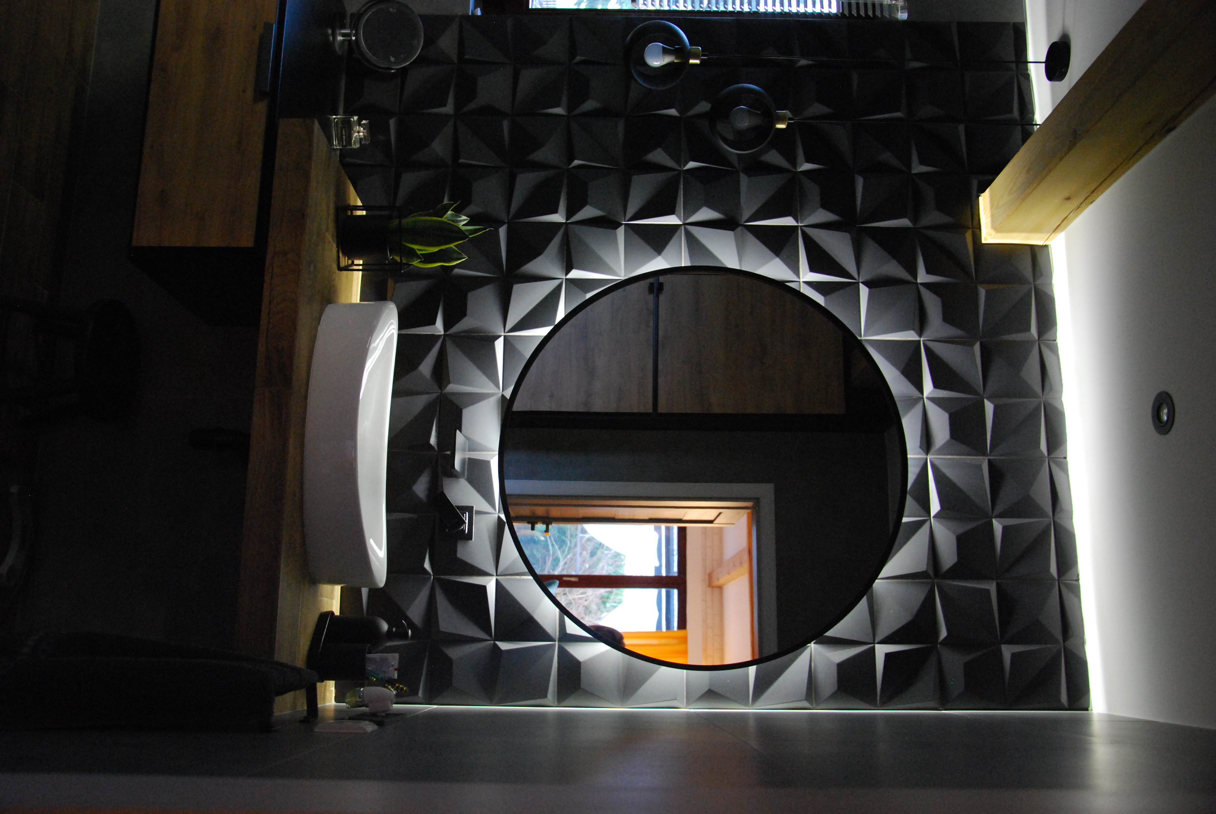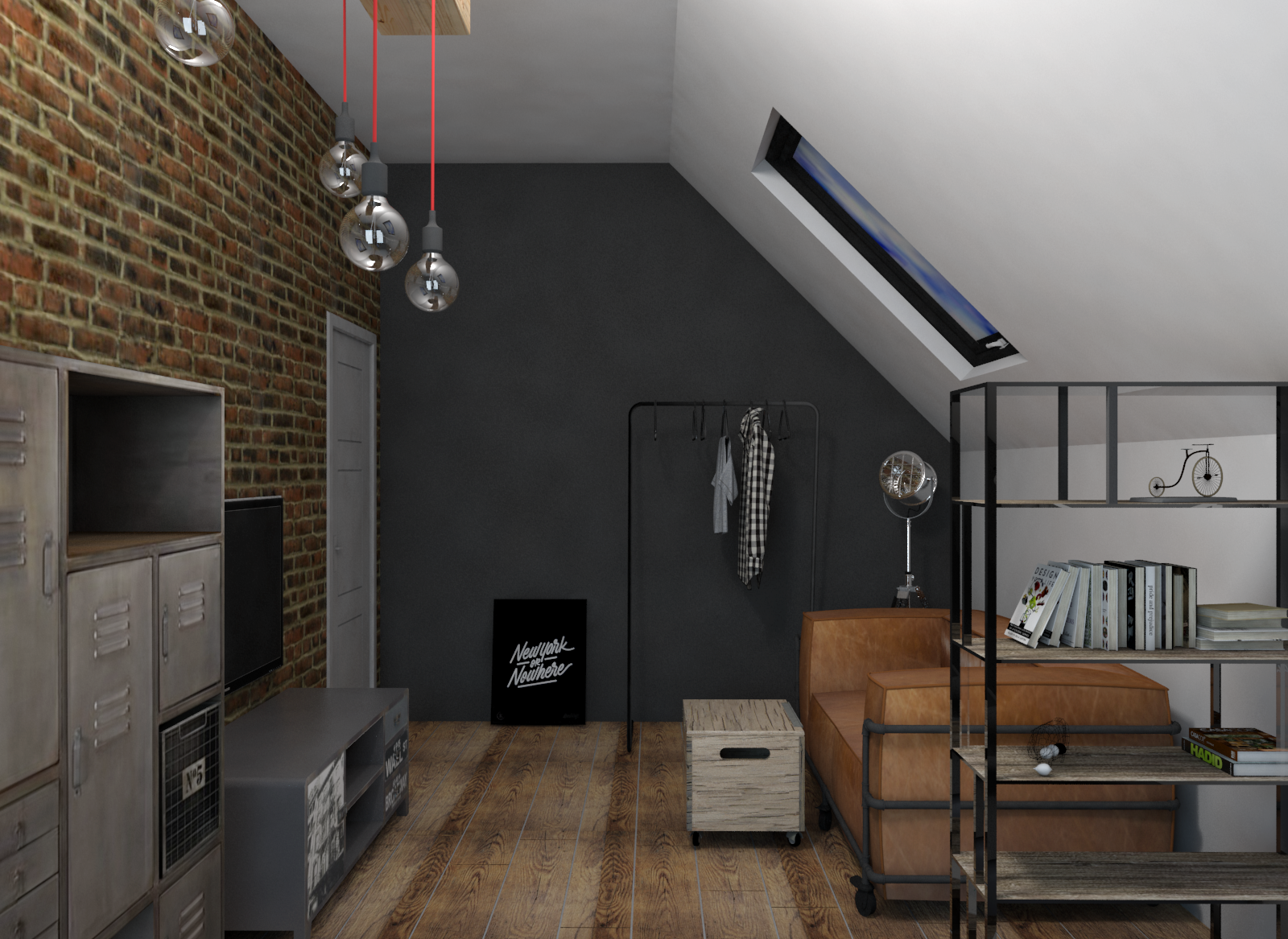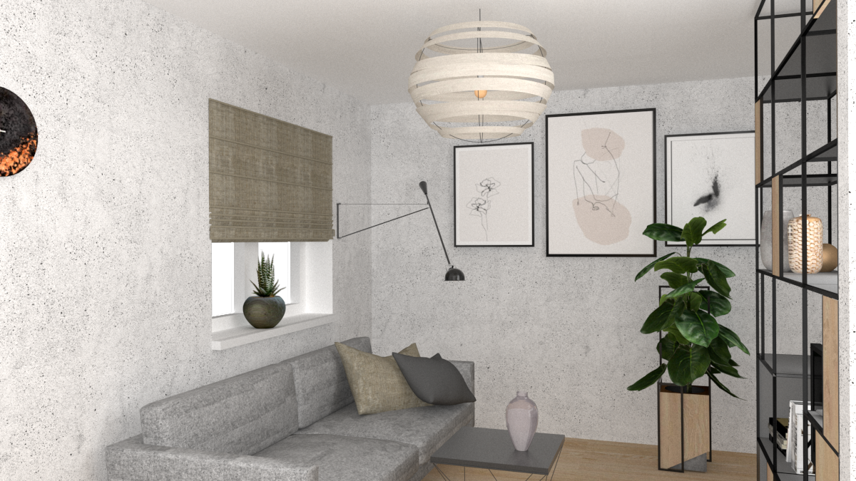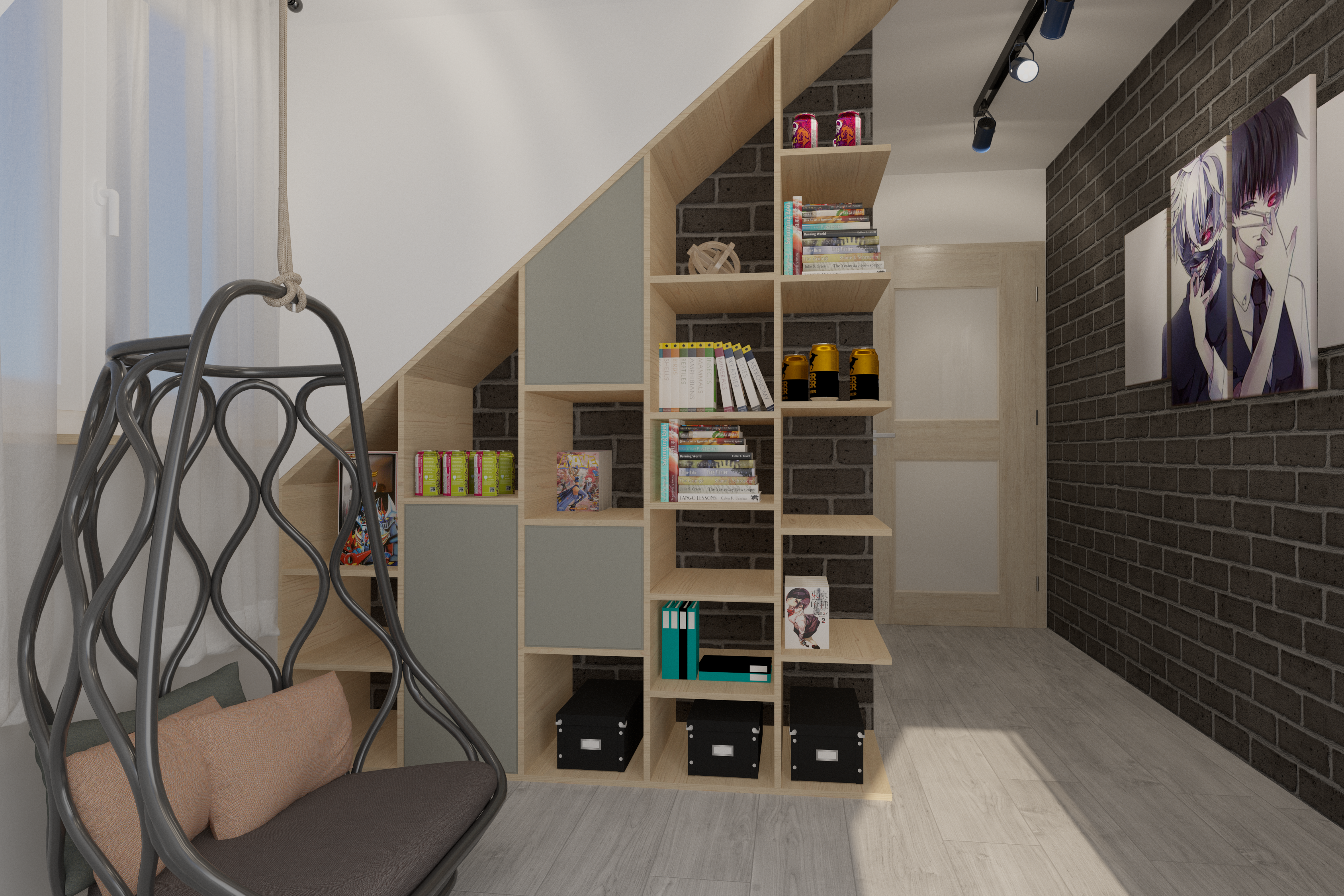 Nie mogło zabraknąć strefy relaksu w postaci wiszącego kosza wiklinowego. Na ścianach zawisły plakaty z motywem mangi, podświetlone reflektorami na szynach. Całość utrzymana jest w kolorze naturalnego drewna i szarości, podkreślonej grafitowa cegłą.