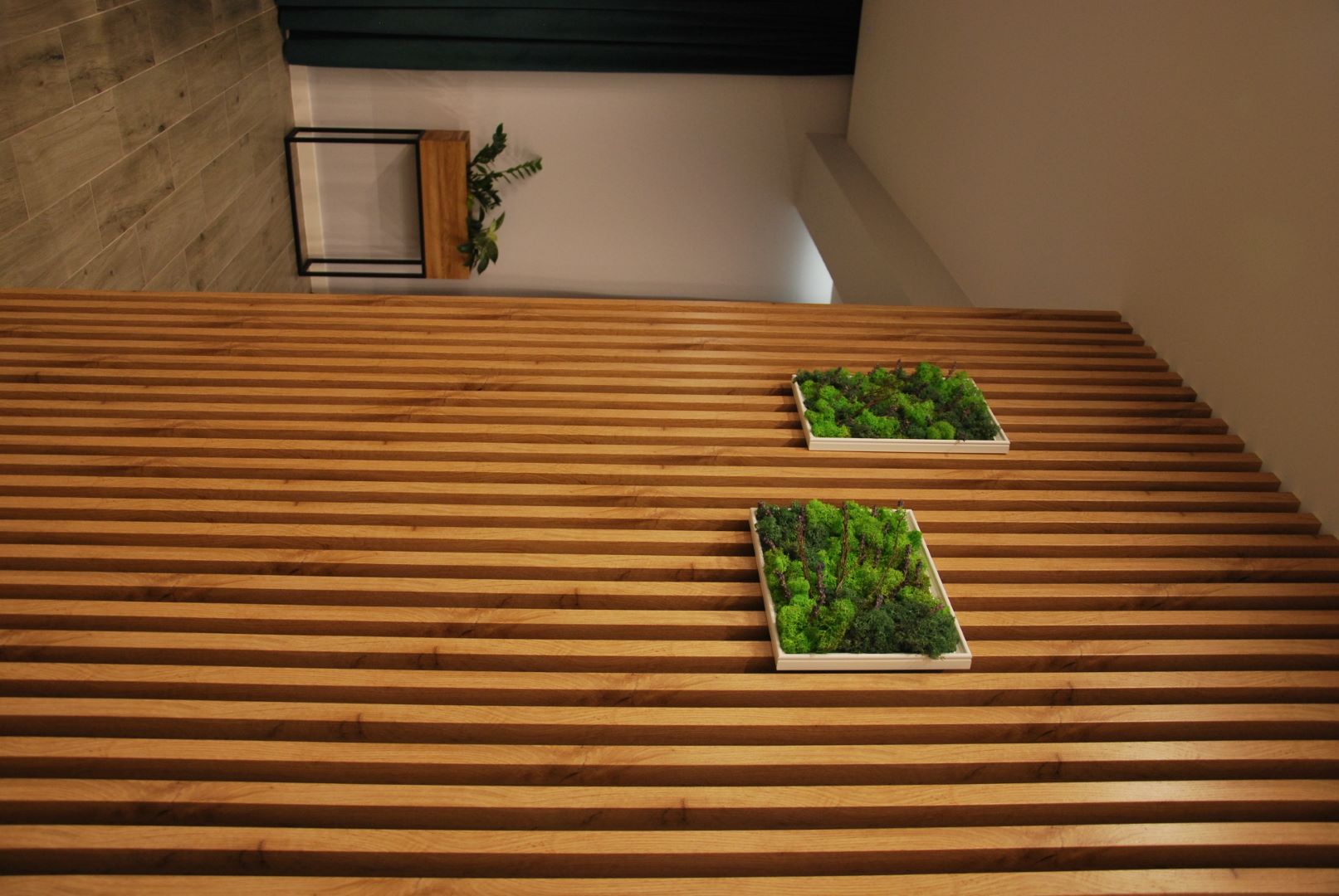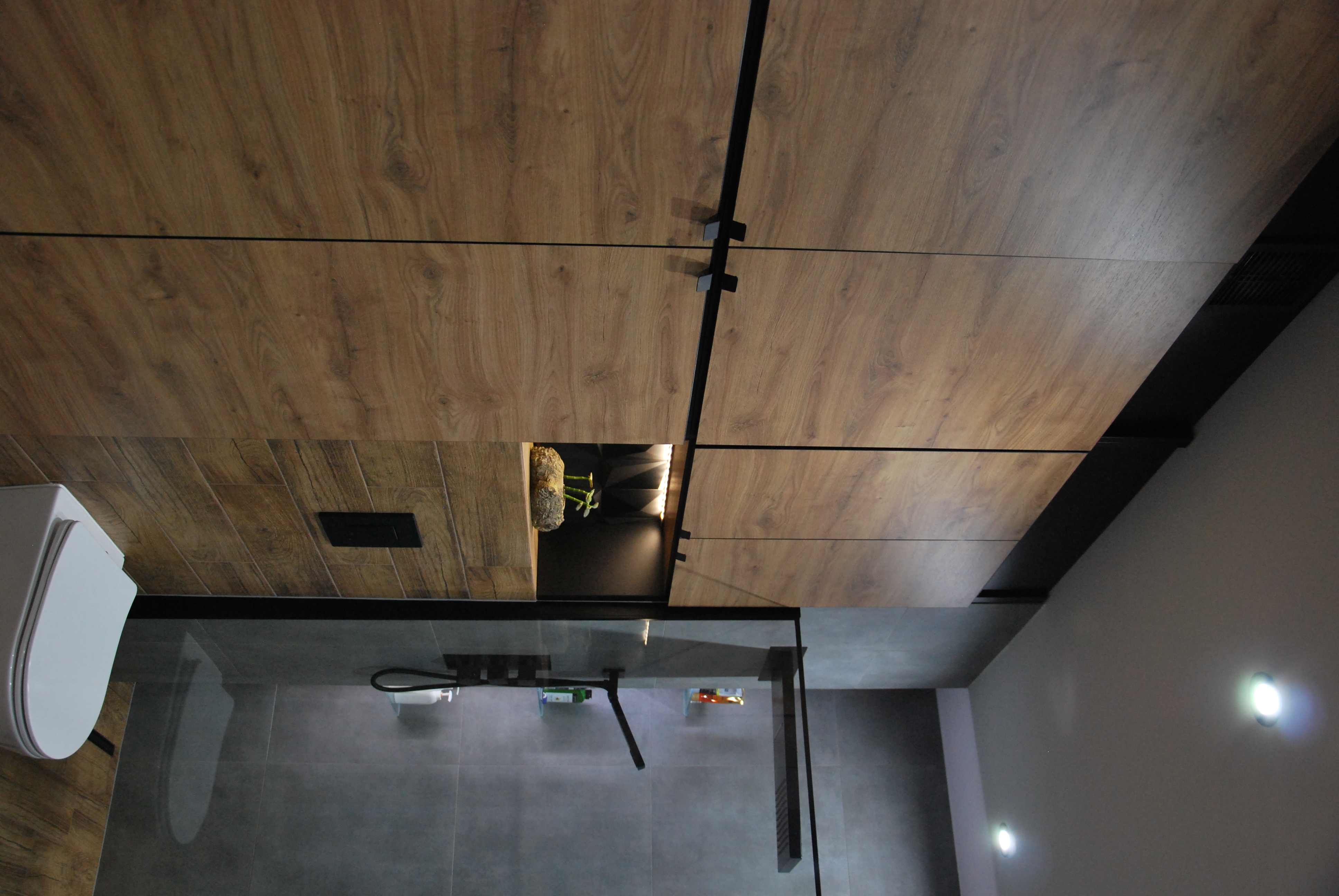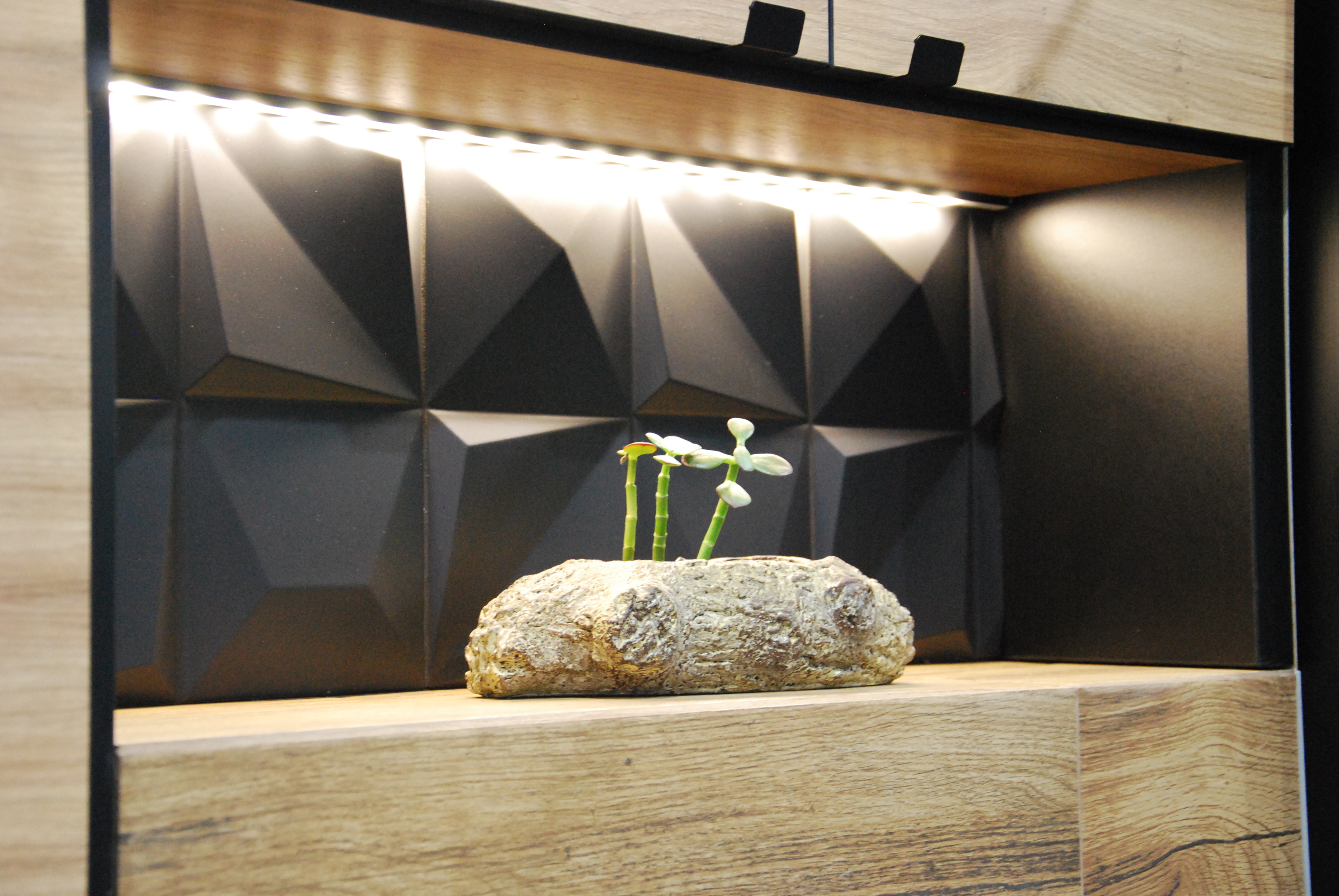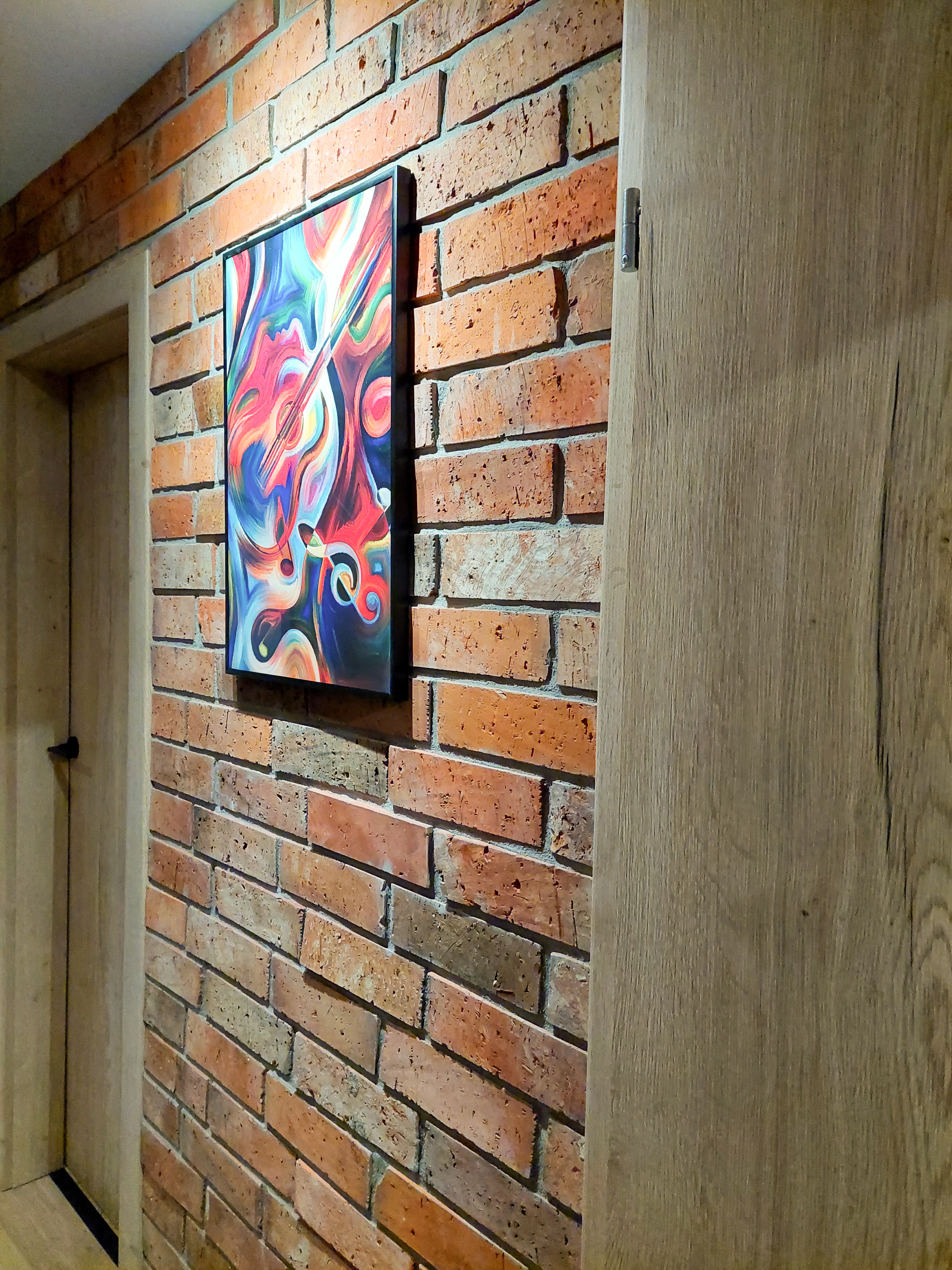 Nie mogło zabraknąć strefy relaksu w postaci wiszącego kosza wiklinowego. Na ścianach zawisły plakaty z motywem mangi, podświetlone reflektorami na szynach. Całość utrzymana jest w kolorze naturalnego drewna i szarości, podkreślonej grafitowa cegłą.