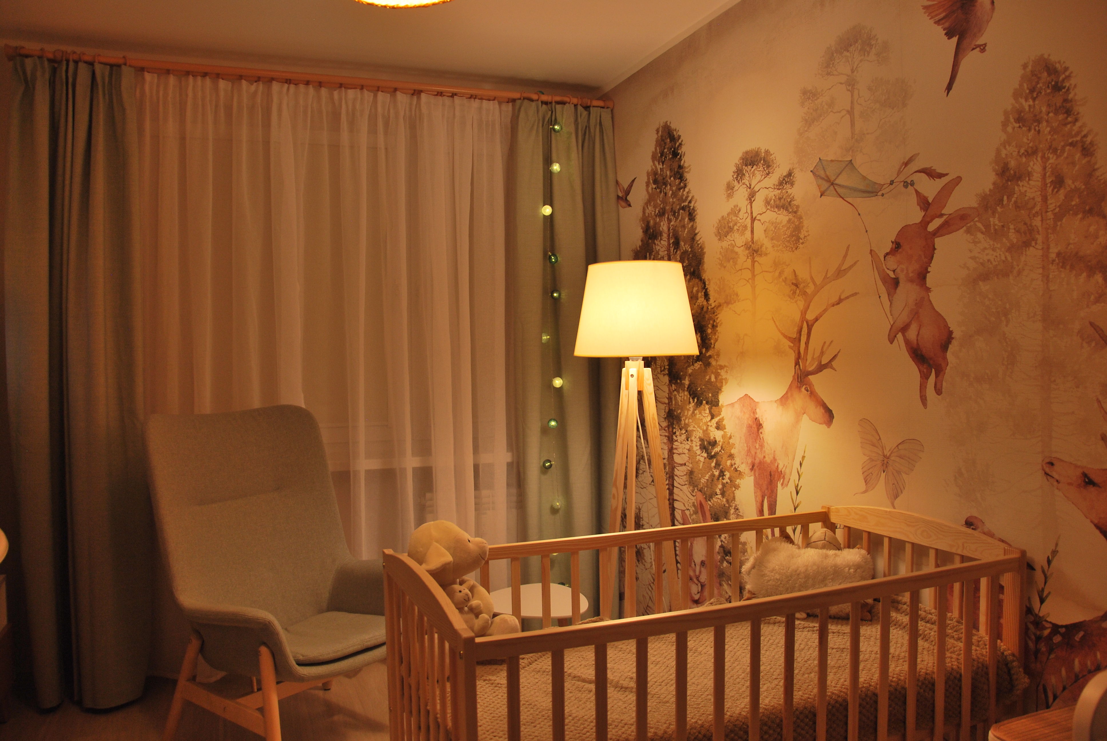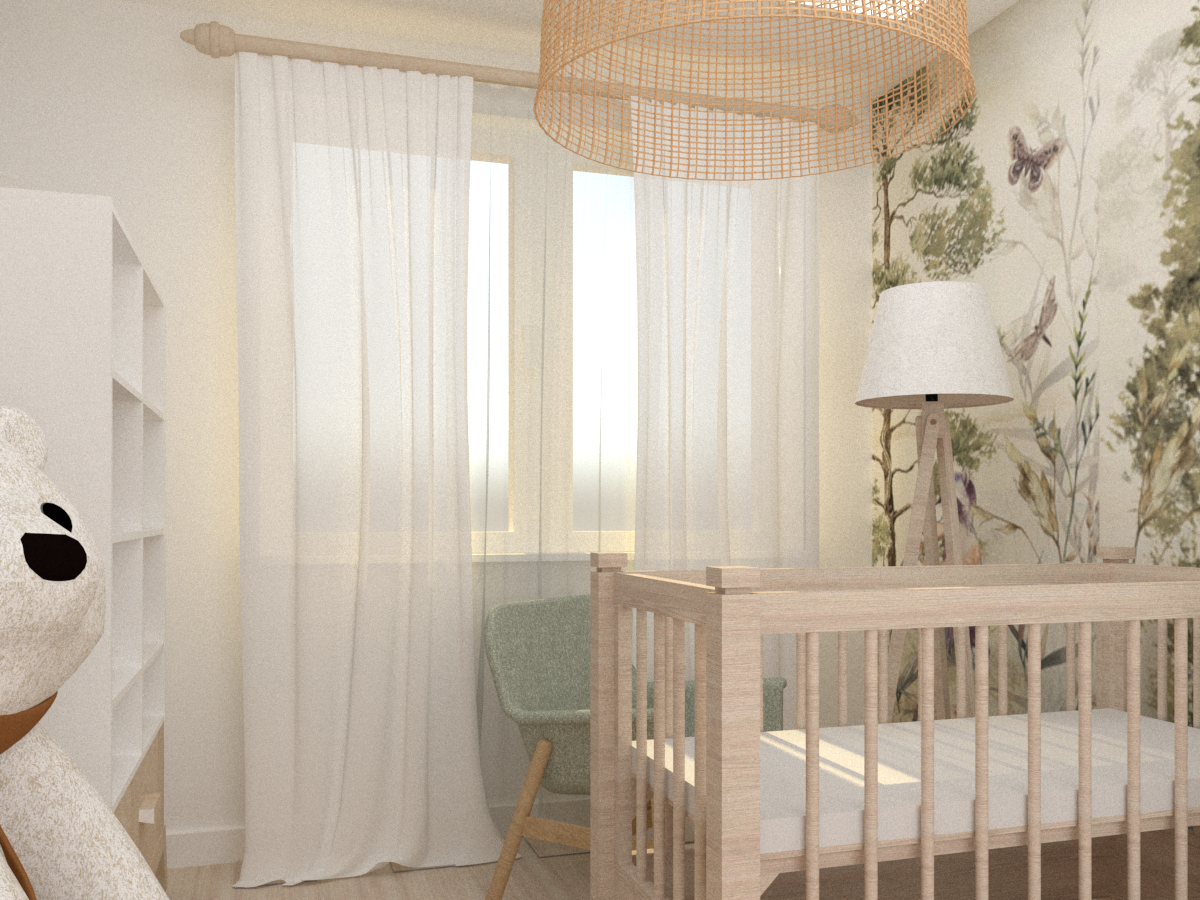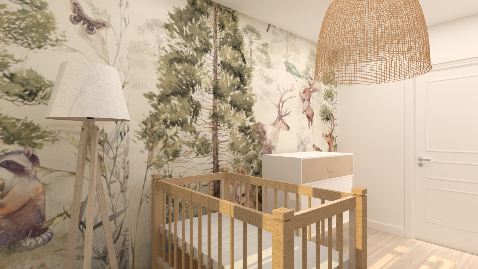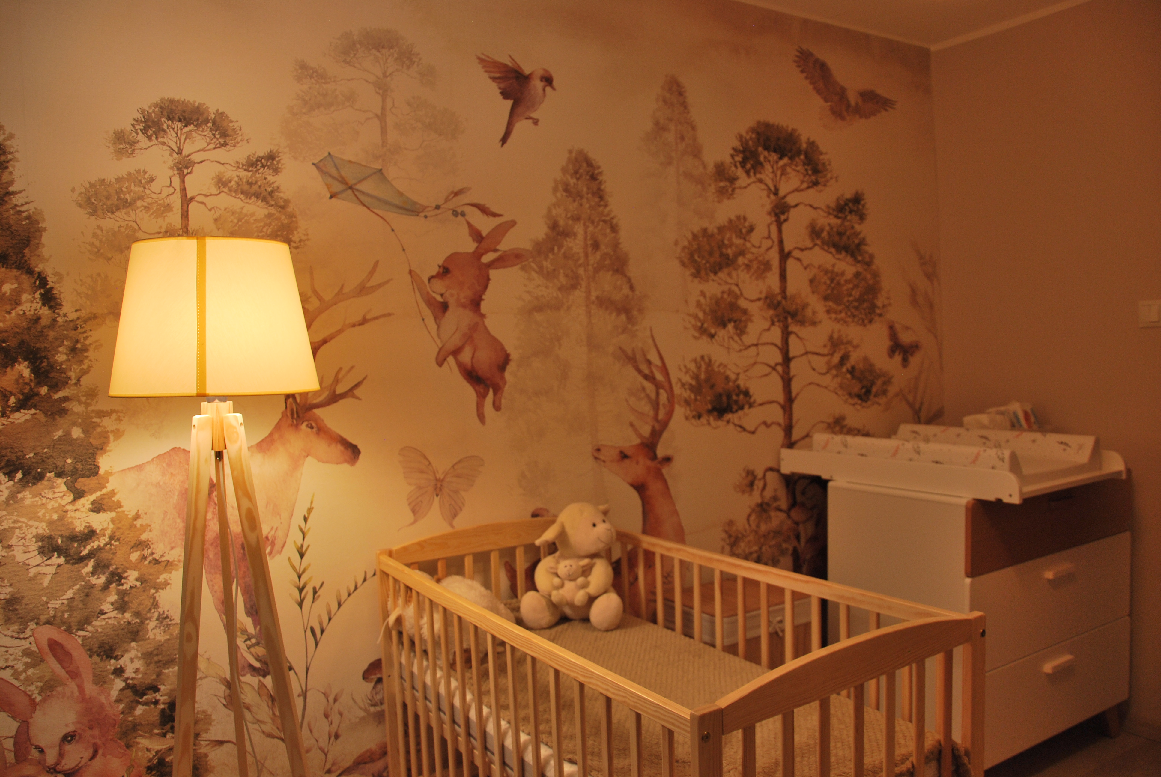 Pokój maluszka musi być przytulny, stonowany i przede wszystkim funkcjonalny, ponieważ najważniejsza jest wygoda mamy i dzidziusia. W prezentowanym projekcie głównym elementem dekoracyjnym jest tapeta z motywem leśnym w stonowanych kolorach firmy eudajmoniawallart. Beże, brązy oraz pastelowa zieleń w połączeniu z naturalnym drewnem i bielą nadają pomieszczeniu lekkości i ciepła. Całość dopełniają klimatyczne lampy.
