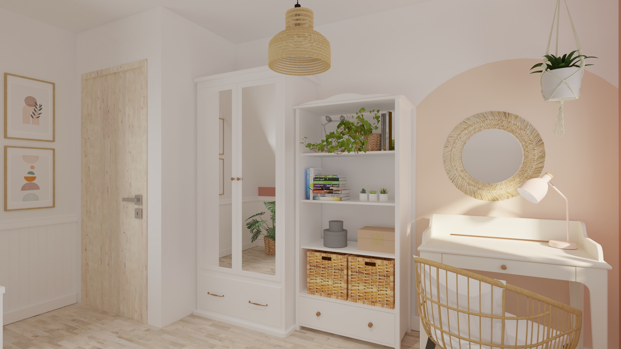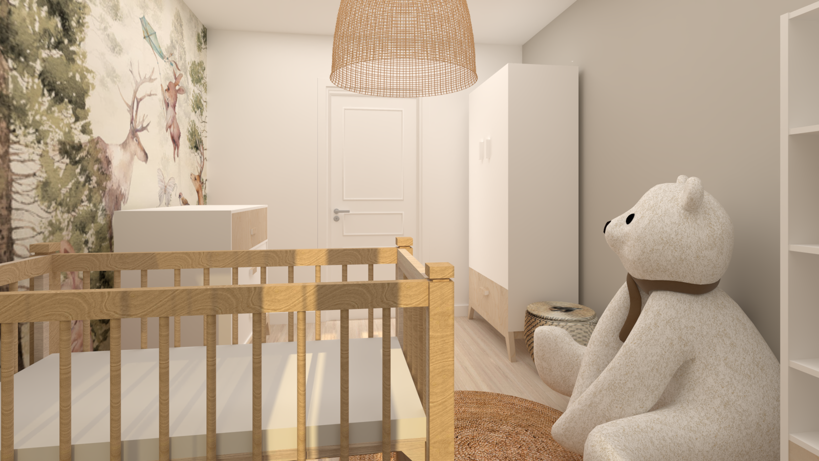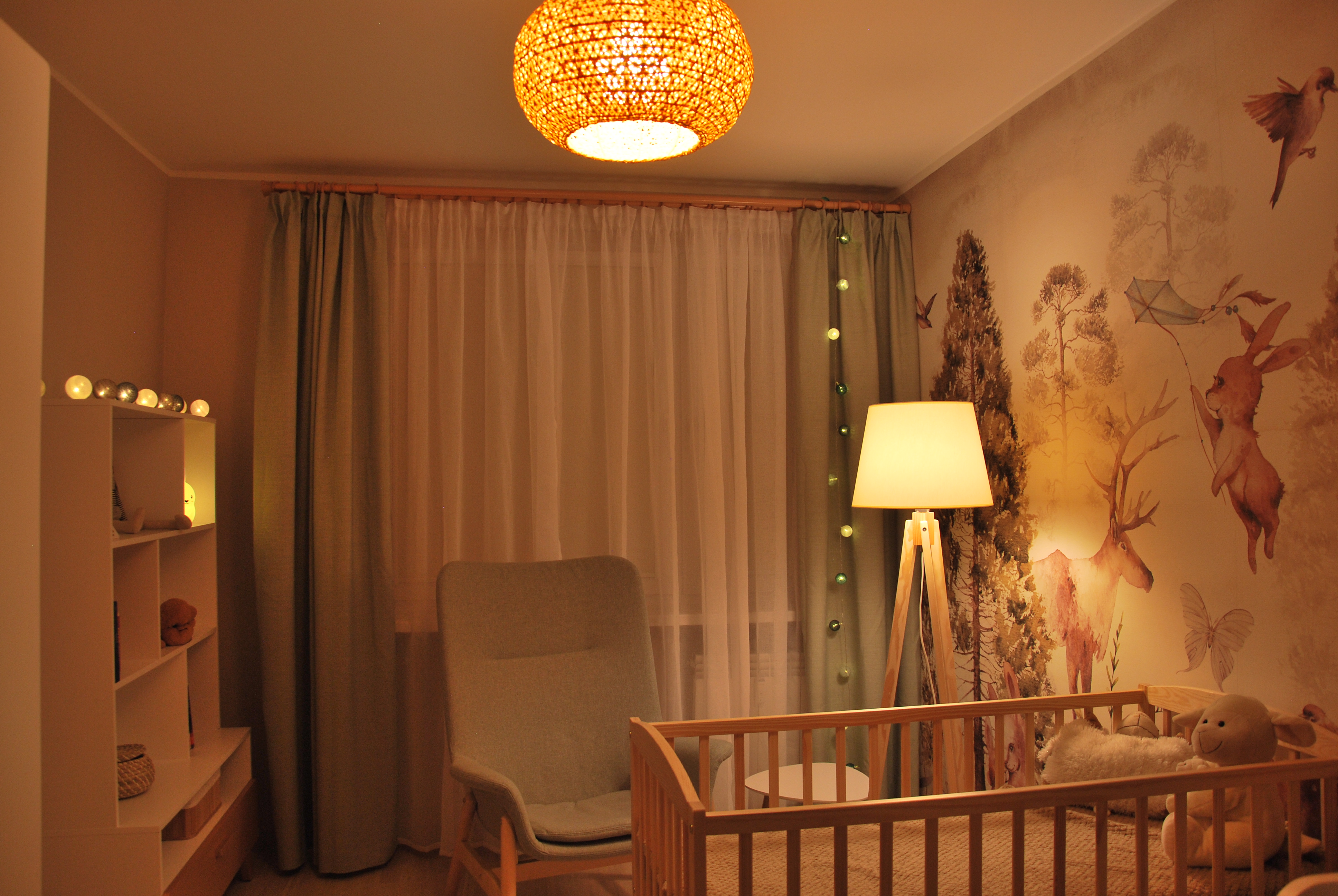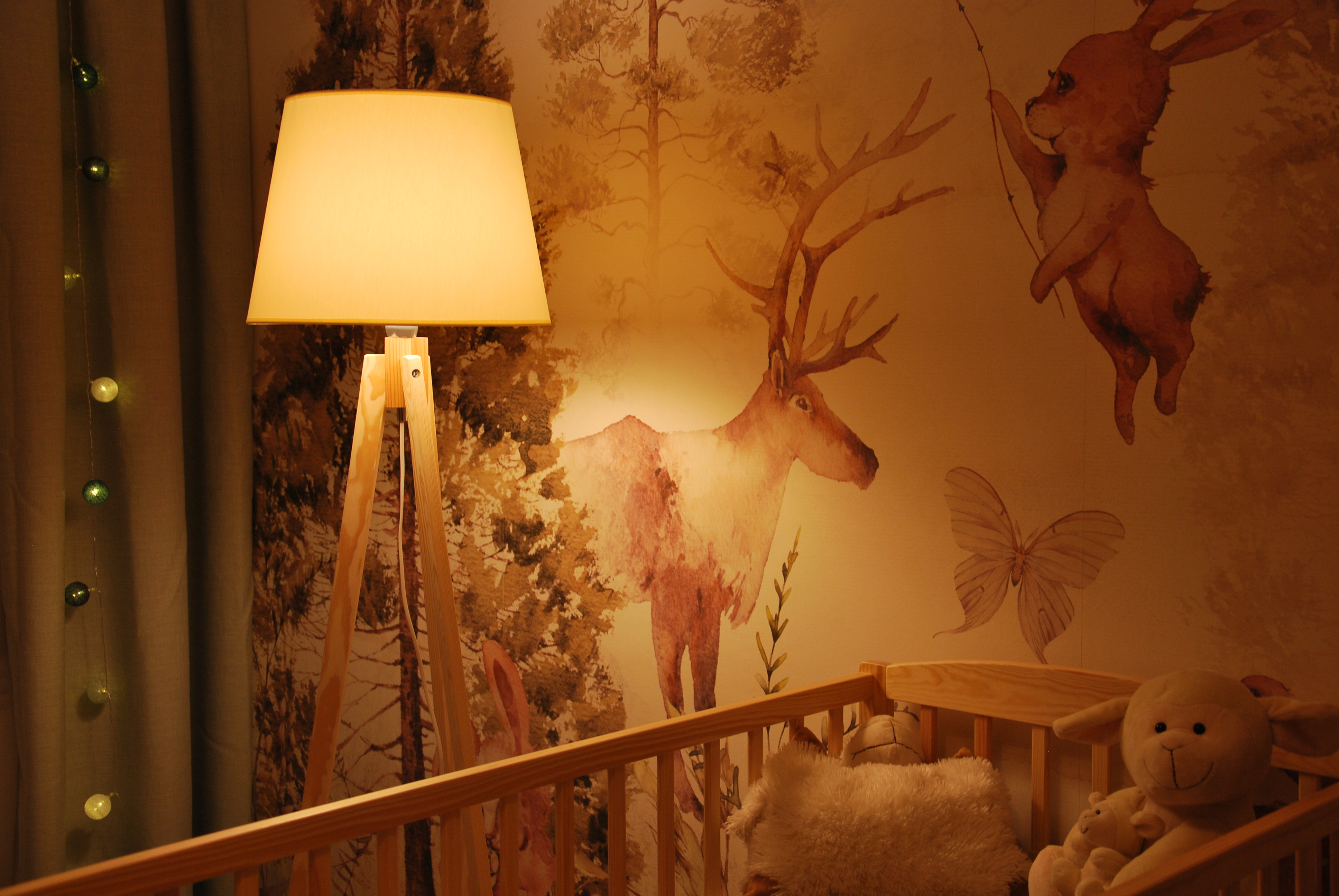 Pokój maluszka musi być przytulny, stonowany i przede wszystkim funkcjonalny, ponieważ najważniejsza jest wygoda mamy i dzidziusia. W prezentowanym projekcie głównym elementem dekoracyjnym jest tapeta z motywem leśnym w stonowanych kolorach firmy eudajmoniawallart. Beże, brązy oraz pastelowa zieleń w połączeniu z naturalnym drewnem i bielą nadają pomieszczeniu lekkości i ciepła. Całość dopełniają klimatyczne lampy.
