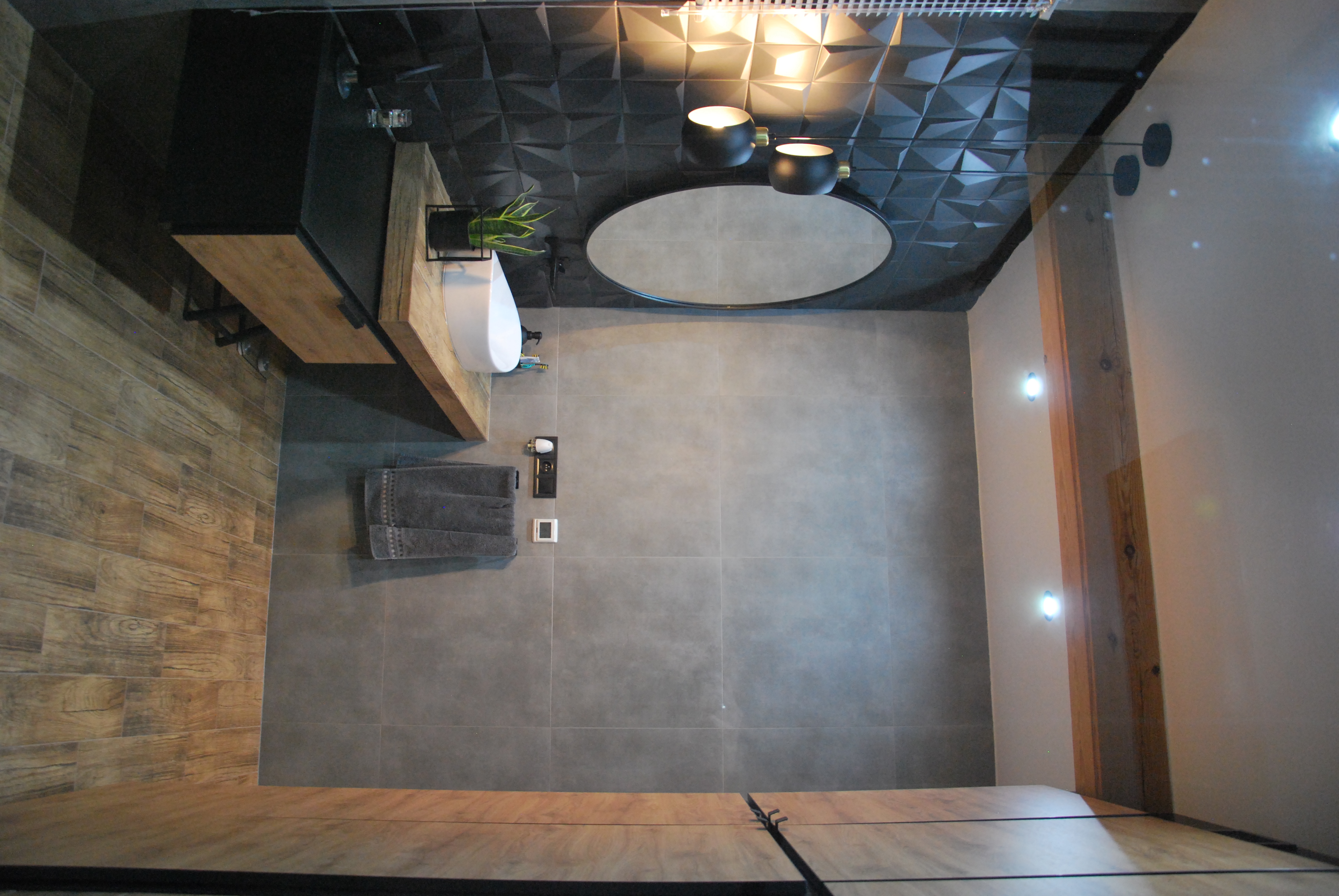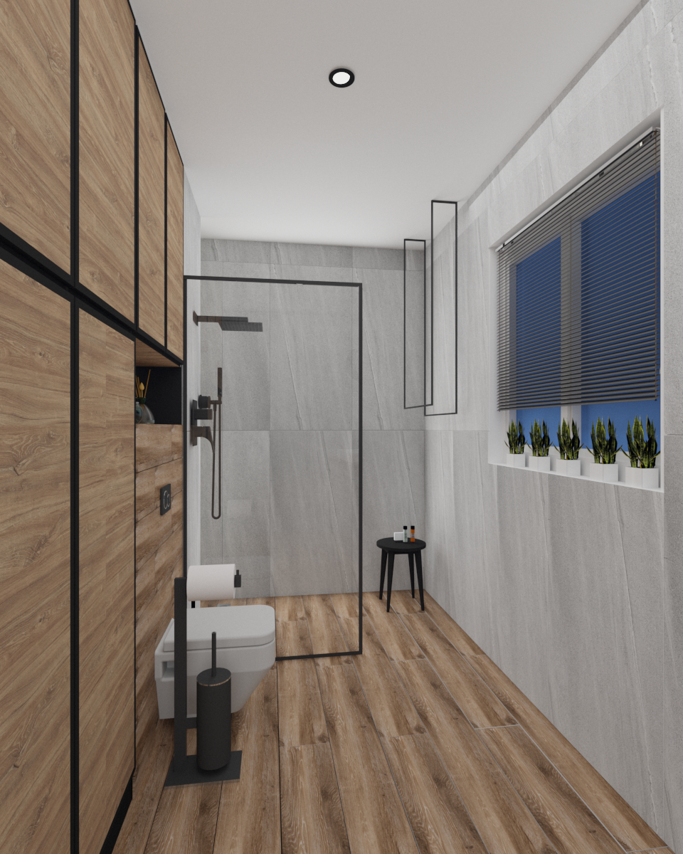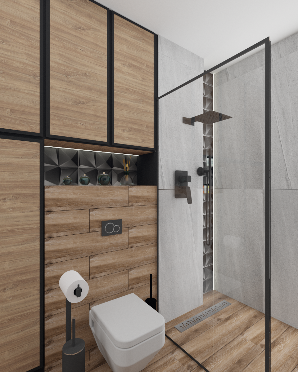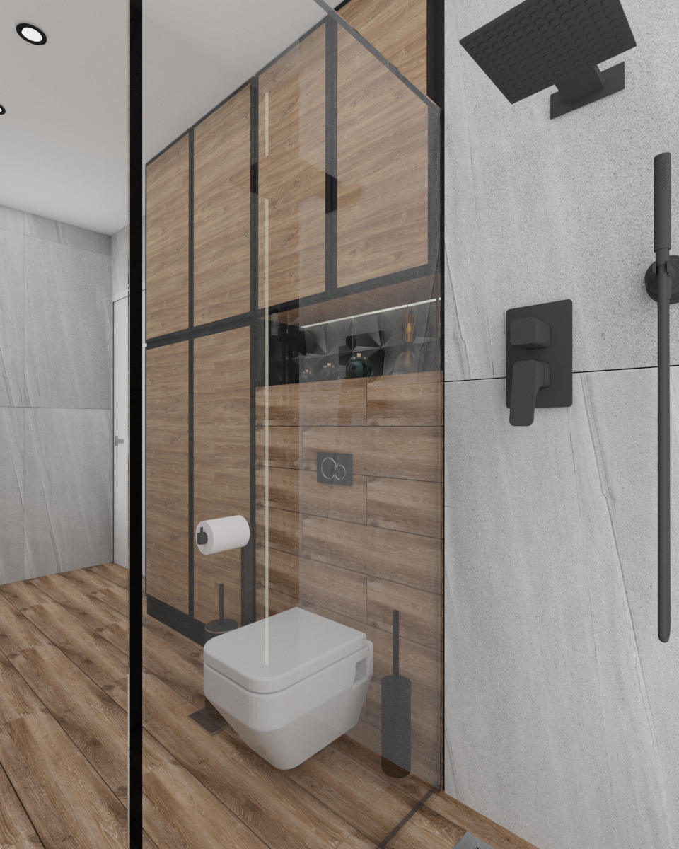 Łazienka z włoskimi płytkami imitującymi marmur. Te płytki gresowe mają bardzo delikatne użylenia, dzięki czemu łazienka ma bardzo delikatny wygląd. Zostały one przełamane płytkami drewnopodobnymi, które dodają łazience ciepła i charakteru.