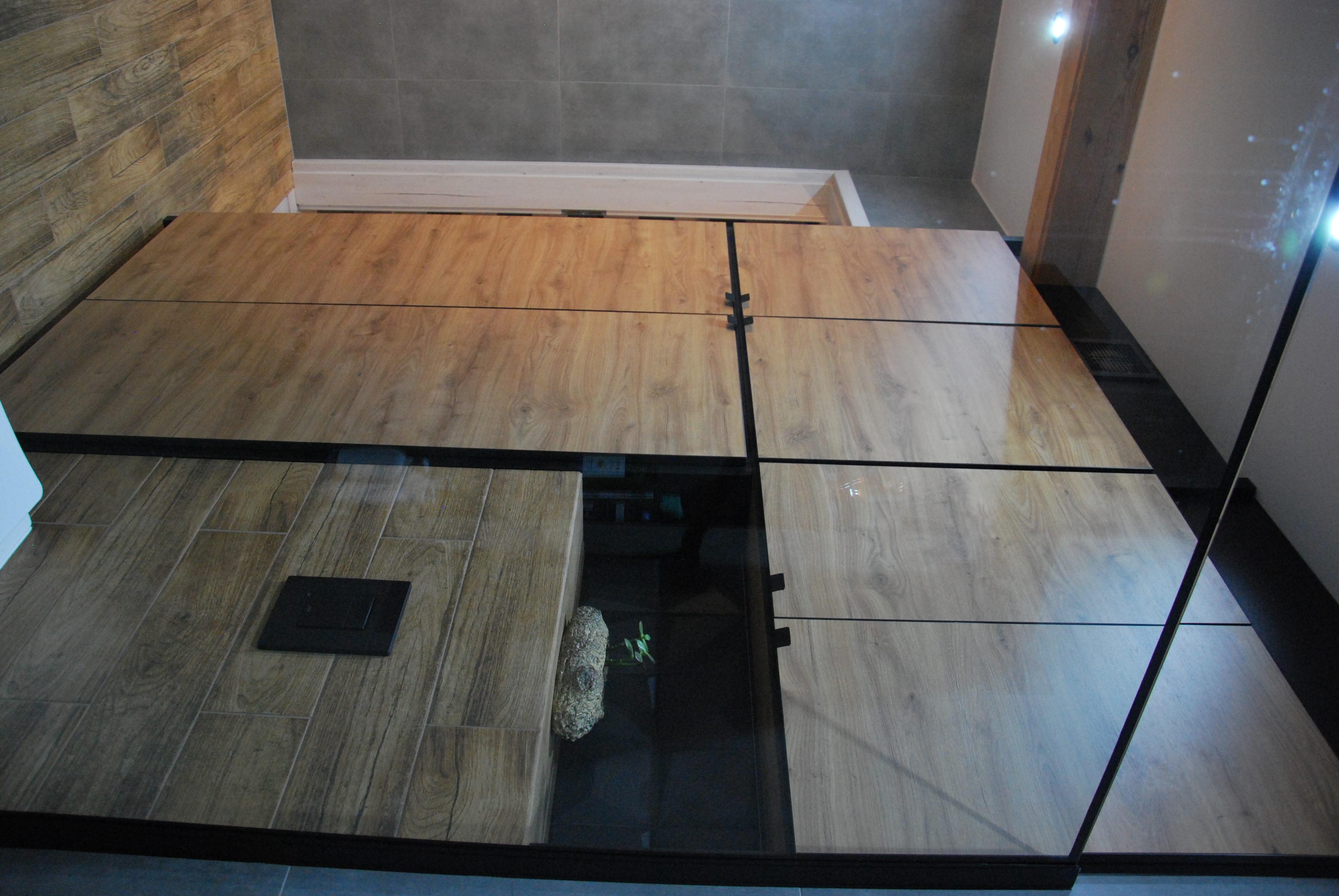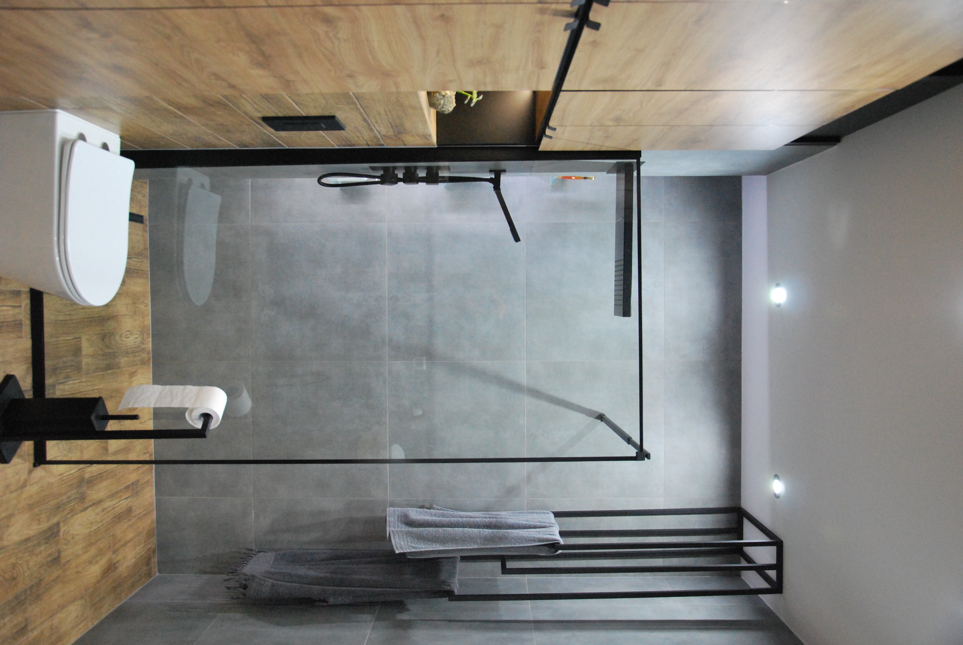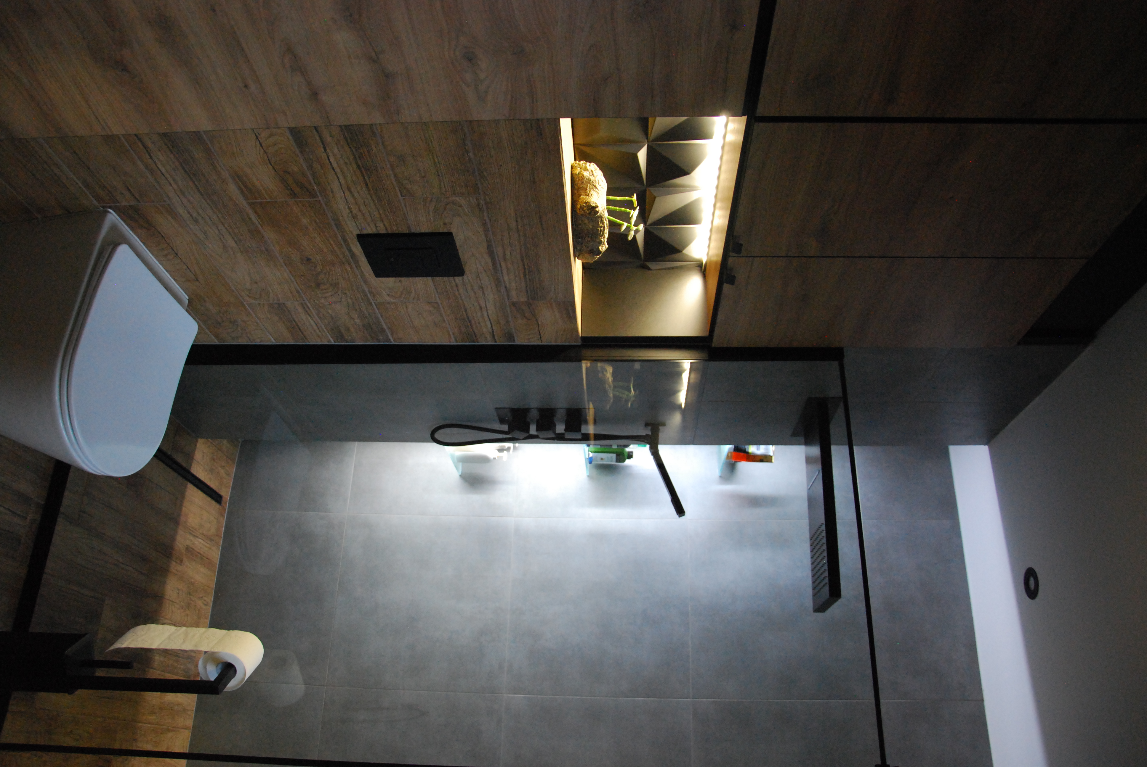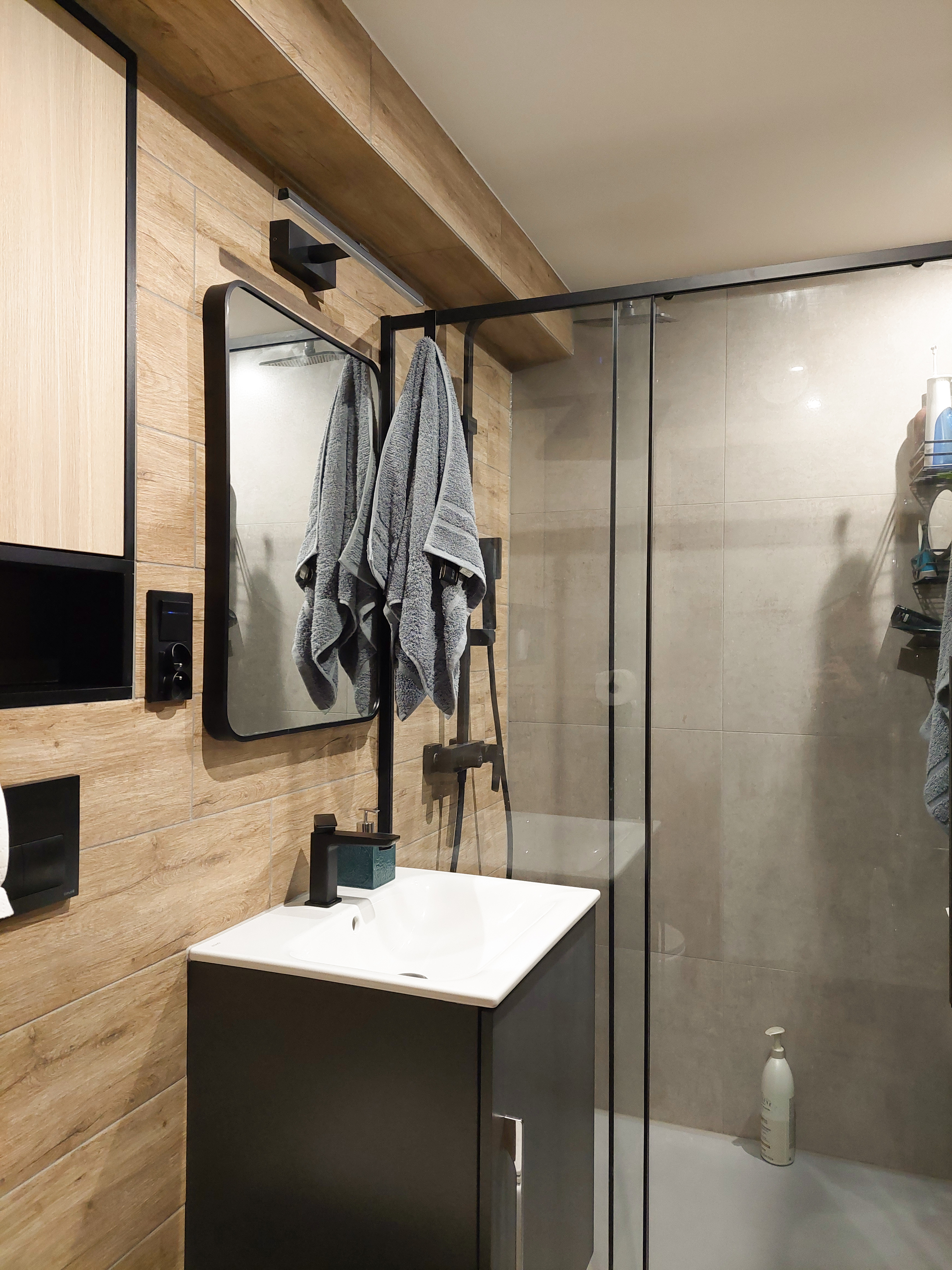 Łazienka z włoskimi płytkami imitującymi marmur. Te płytki gresowe mają bardzo delikatne użylenia, dzięki czemu łazienka ma bardzo delikatny wygląd. Zostały one przełamane płytkami drewnopodobnymi, które dodają łazience ciepła i charakteru.