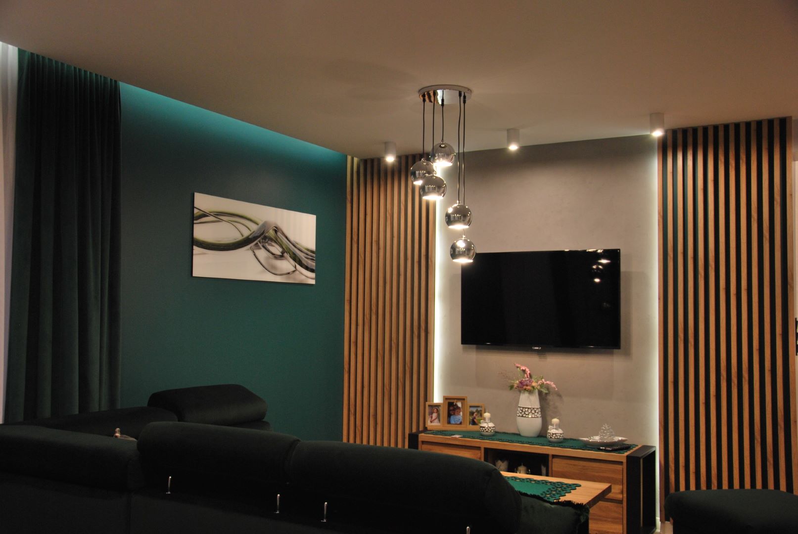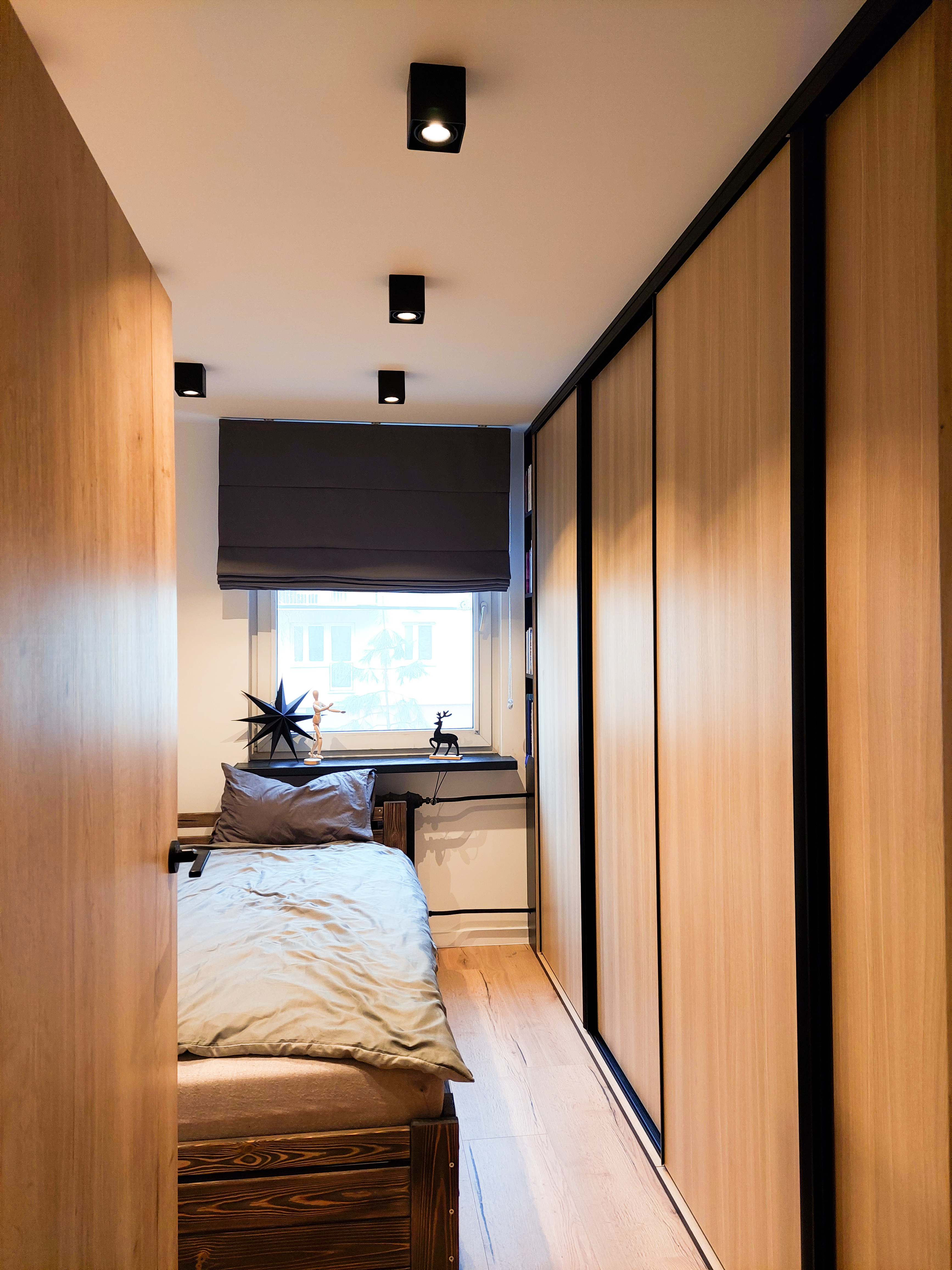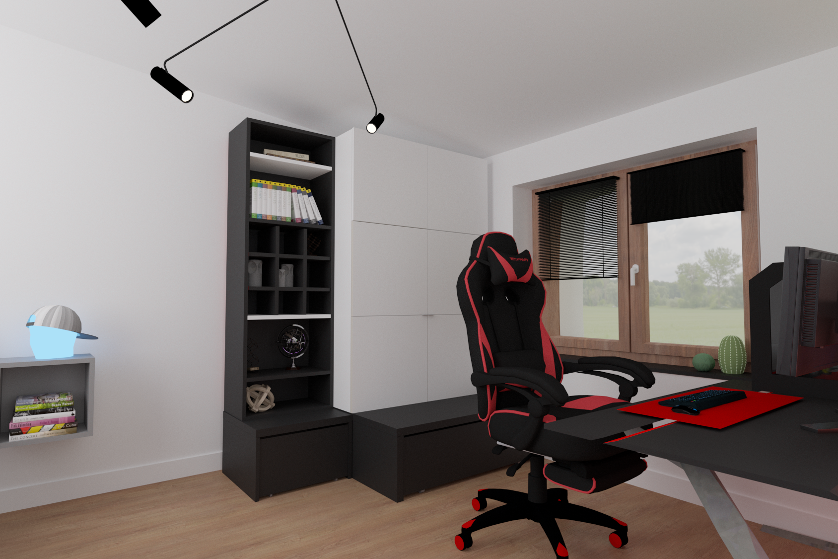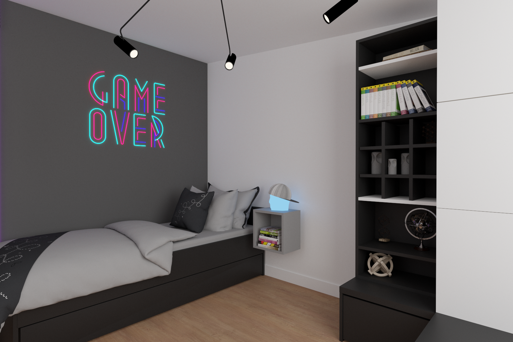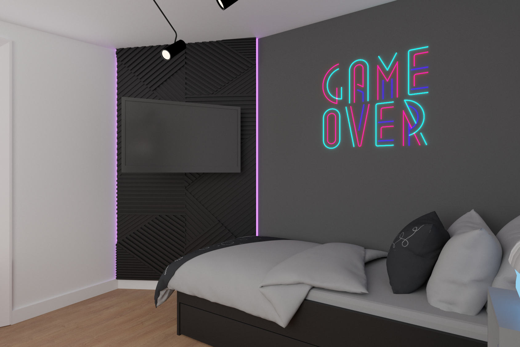 Musiało się w nim znaleźć ogromne biurko gamingowe i oczywiście wygodny fotel firmy Diablo. Aby nic dodatkowo nie rozpraszało naszego gracza, na części ścian zagościła klasyczna, ponadczasowa biel. Marzeniem mojego młodego klienta był neon. Dodatkowo go uwypukliłam i nadałam mu charakteru, umieszczając go na grafitowym tle. Nie mogło zabraknąć również paneli wytłumiających, w tym przypadku zastosowałam korkowe panele w kolorze czerni, na których zawisł telewizor. Za biurkiem umieściłam ścienny organizer firmy Ikea, który pozwoli utrzymać porządek na biurku z paskami ledowymi. Wszelkie młodzieżowe skarby i gry planszowe zniknęły w zamykanych szafkach. Całość doświetla nam przepiękna czarna lampa z regulowanymi reflektorami firmy Nowodvorski.
