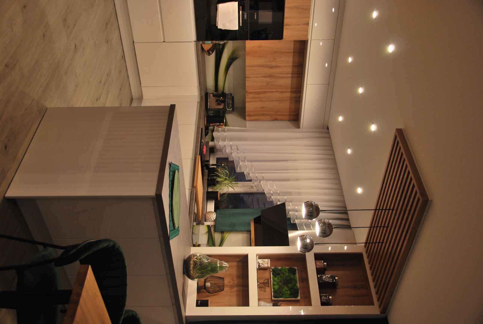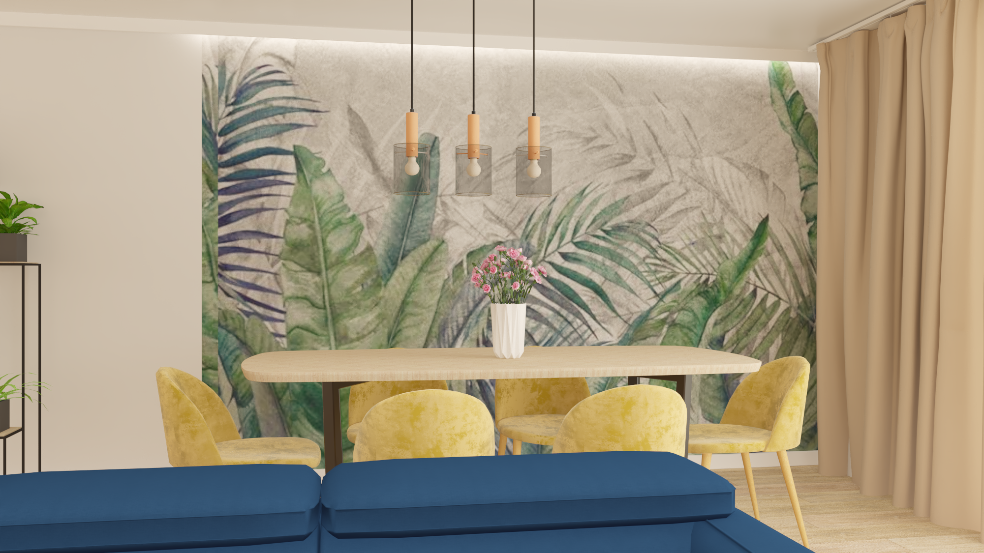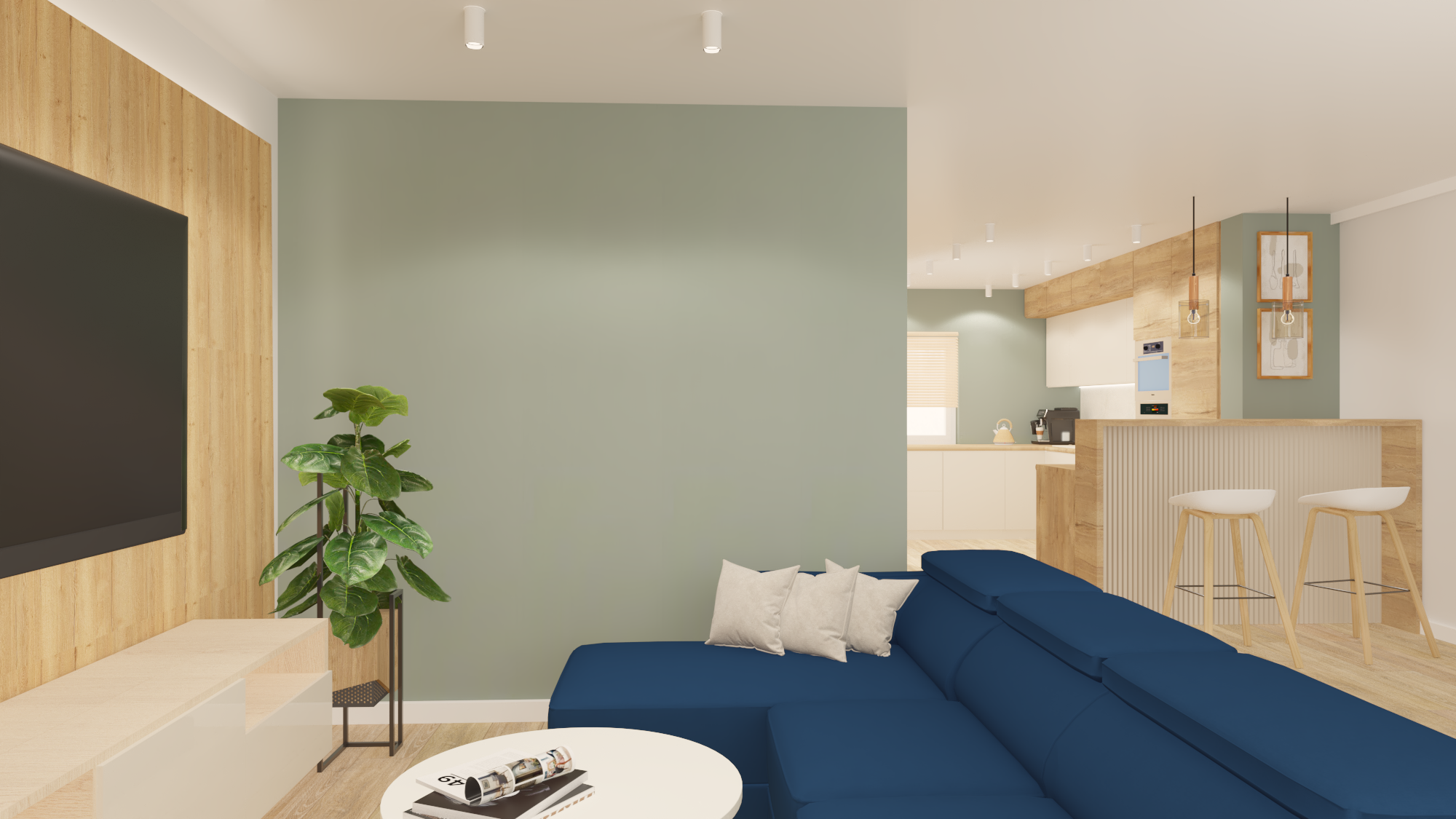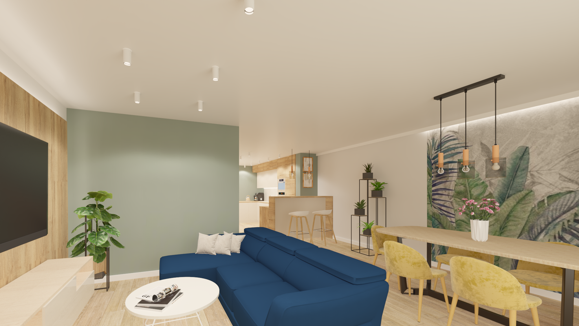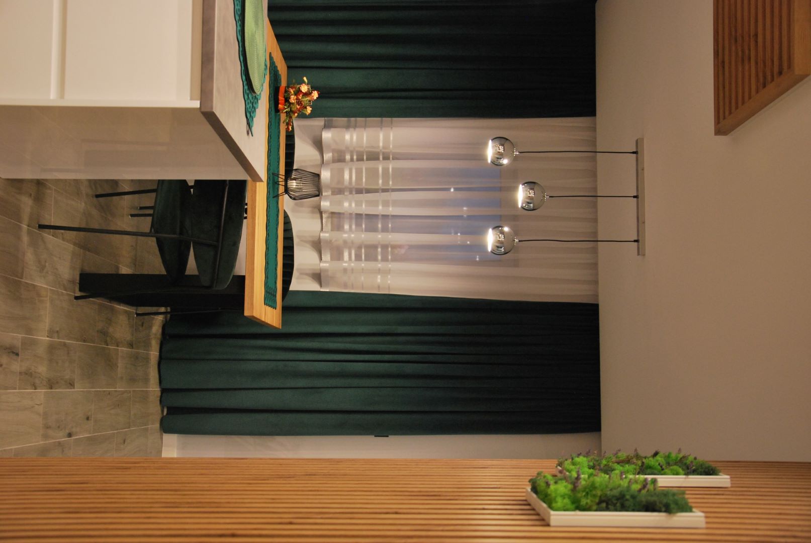 Projekt obejmował część dzienną wraz z kuchnią. Założeniem było, by ograniczyć meble do koniecznego minimum. Tak powstała przytulna i jasna strefa wypoczynkowa wraz z częścią kuchenną i jadalnianą o łagodnym charakterze, odzwierciedlająca upodobania moich klientów. Przyczyniła się do tego przestronna beżowo-drewniana kuchnia i podłogi w kolorze ciepłego drewna. Natomiast charakteru dodała całości pastelowa, szałwiowa ściana oraz stonowana kolorystycznie tapeta z roślinnym wzorem. W części jadalnianej ustawiłam duży stół z midowymi welurowymi krzesłami. W strefie wypoczynku stanęła granatowa, wygodna kanapa. Krzesla i kanapa swoimi barwami nawiązują do magicznej tapety – tworząc bajeczną całość.