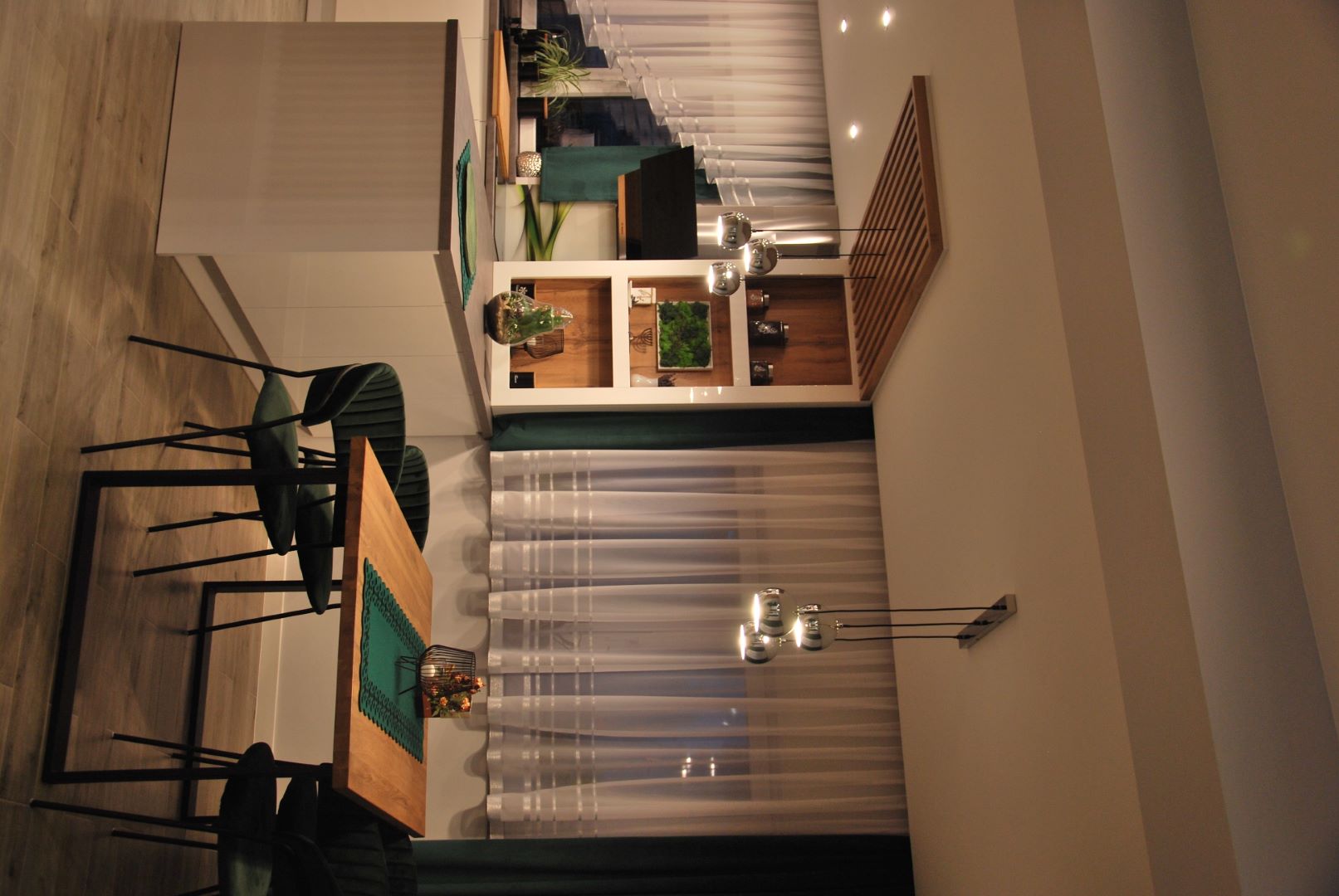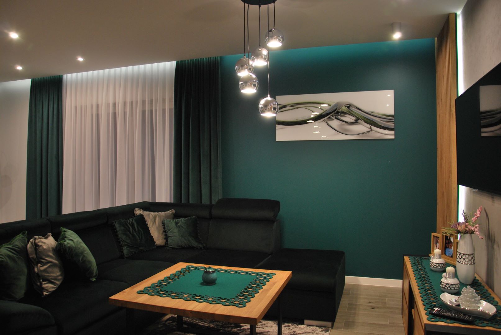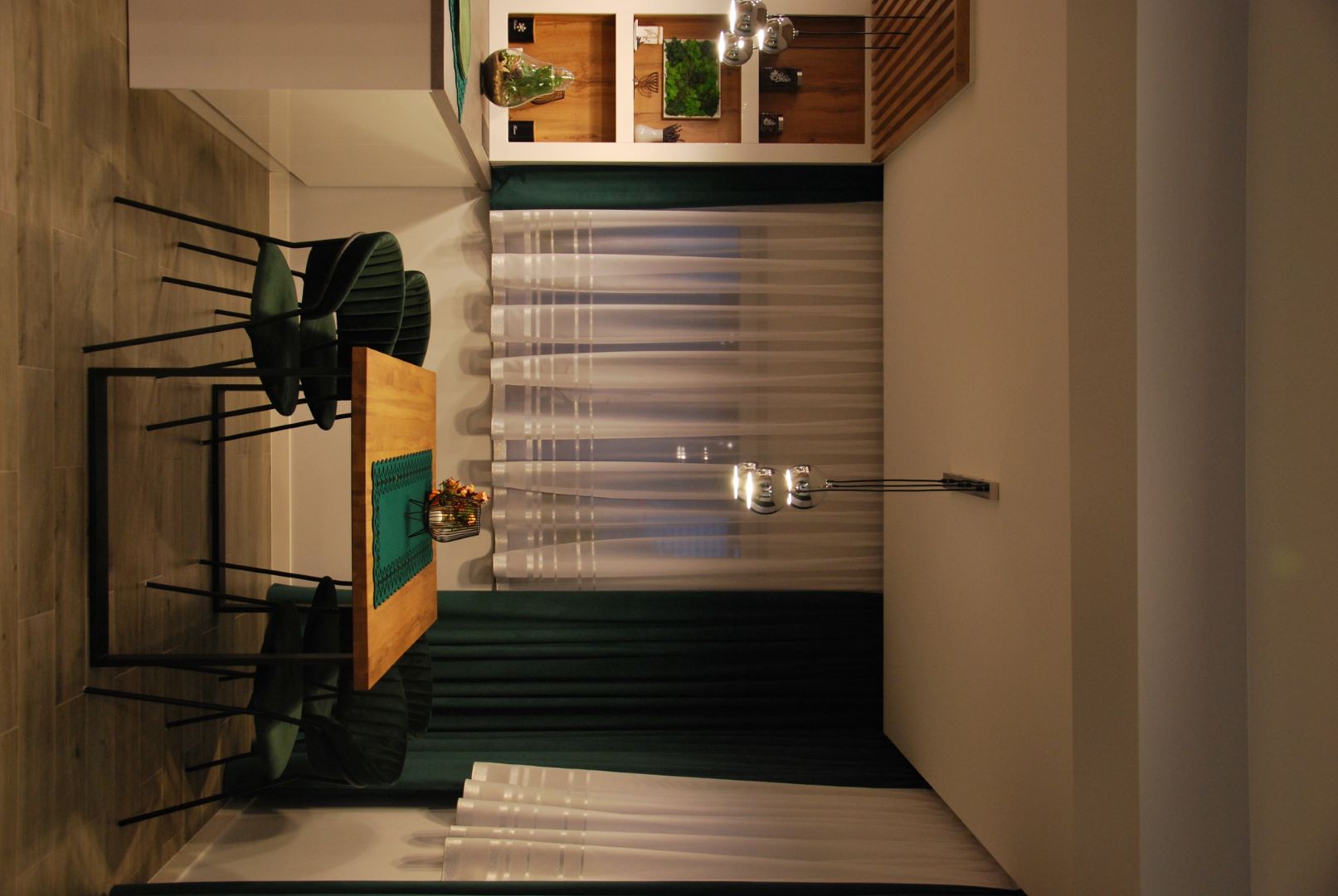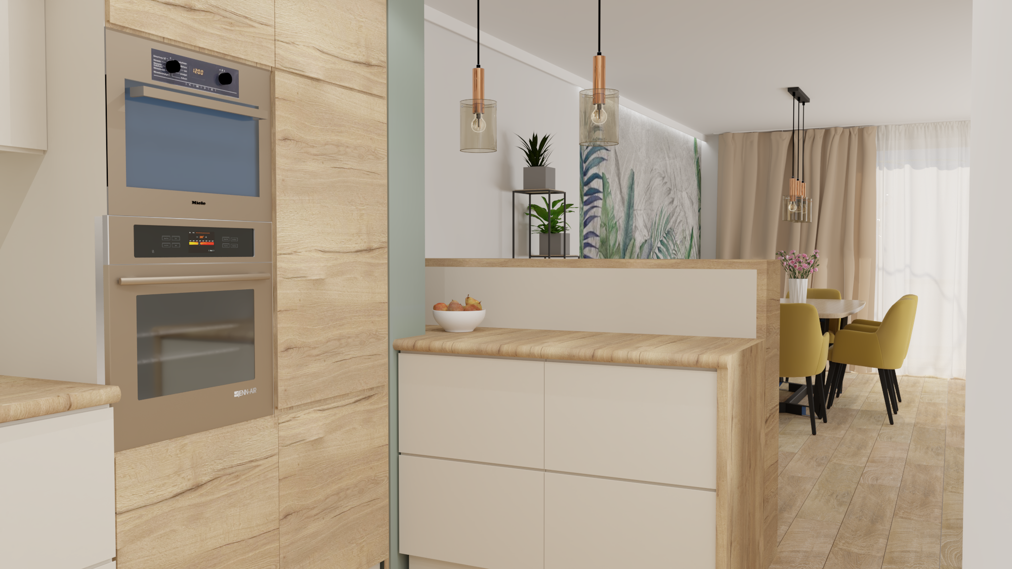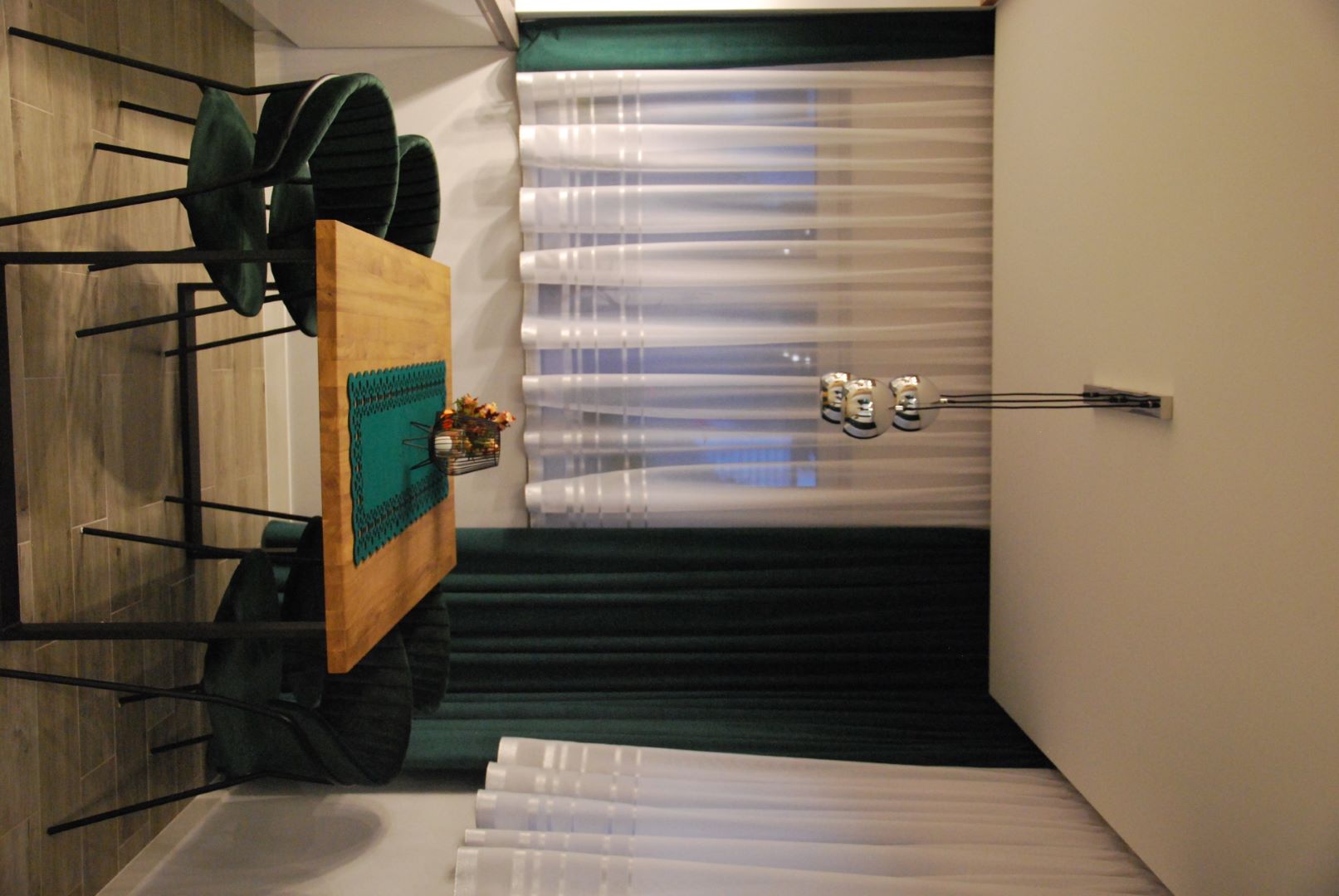 Projekt obejmował część dzienną wraz z kuchnią. Założeniem było, by ograniczyć meble do koniecznego minimum. Tak powstała przytulna i jasna strefa wypoczynkowa wraz z częścią kuchenną i jadalnianą o łagodnym charakterze, odzwierciedlająca upodobania moich klientów. Przyczyniła się do tego przestronna beżowo-drewniana kuchnia i podłogi w kolorze ciepłego drewna. Natomiast charakteru dodała całości pastelowa, szałwiowa ściana oraz stonowana kolorystycznie tapeta z roślinnym wzorem. W części jadalnianej ustawiłam duży stół z midowymi welurowymi krzesłami. W strefie wypoczynku stanęła granatowa, wygodna kanapa. Krzesla i kanapa swoimi barwami nawiązują do magicznej tapety – tworząc bajeczną całość.