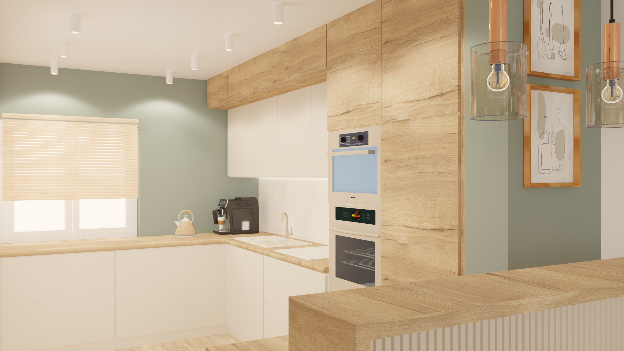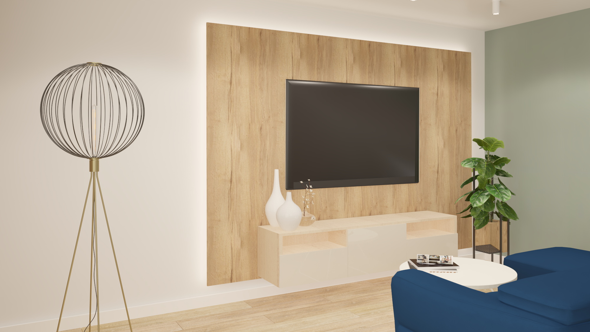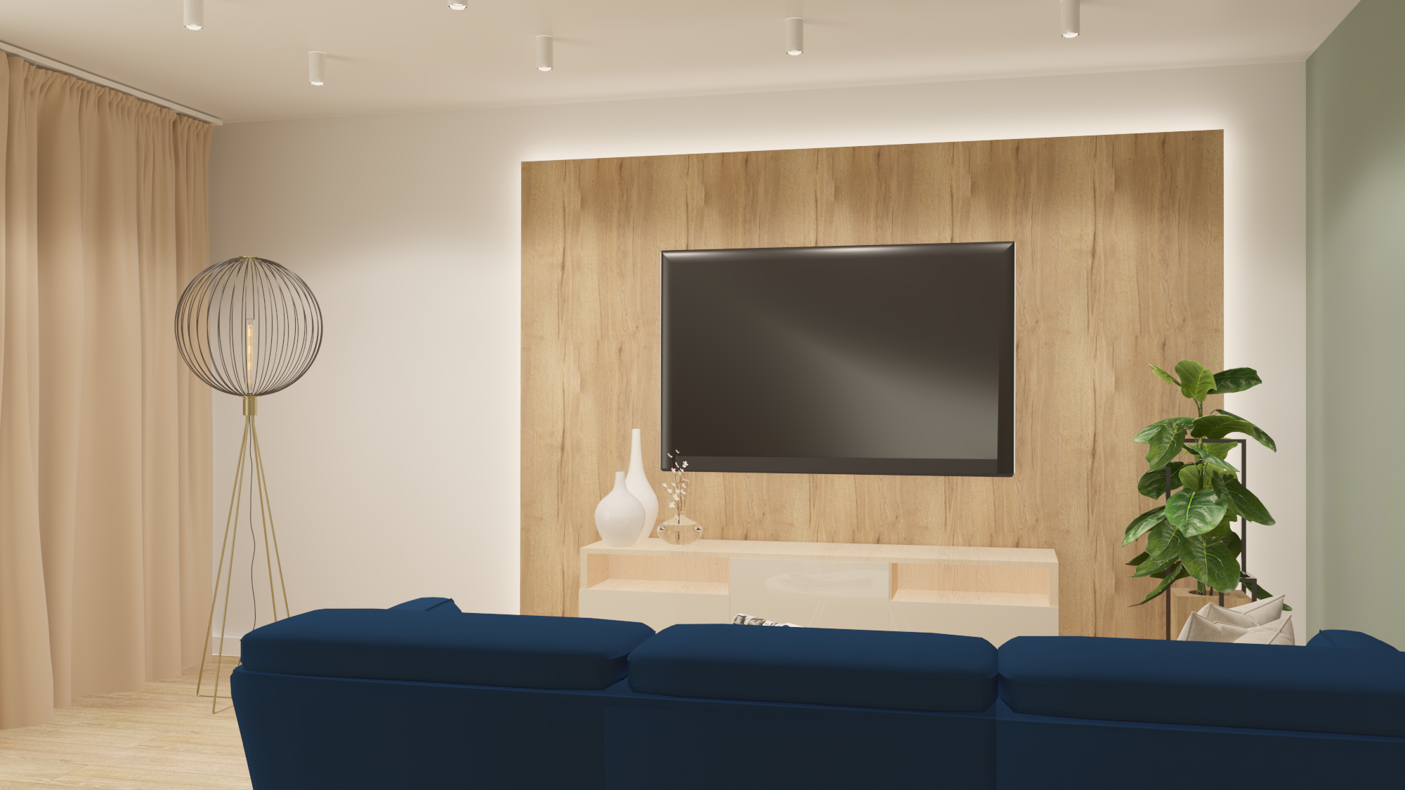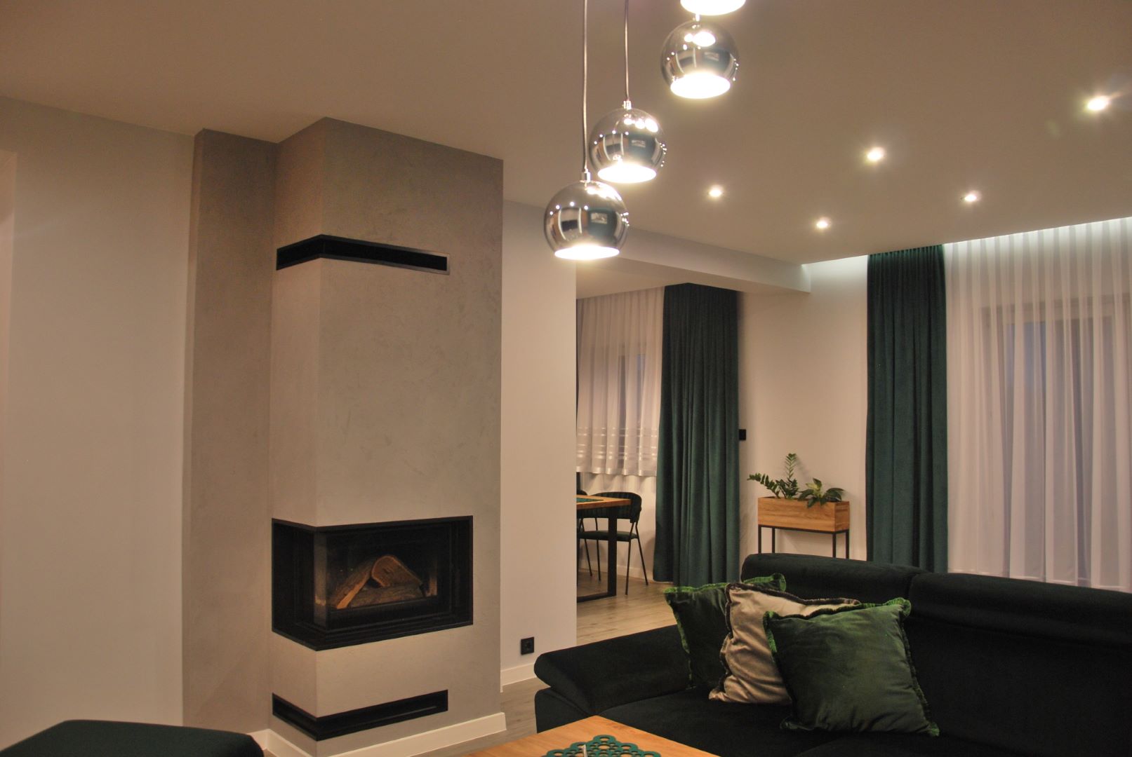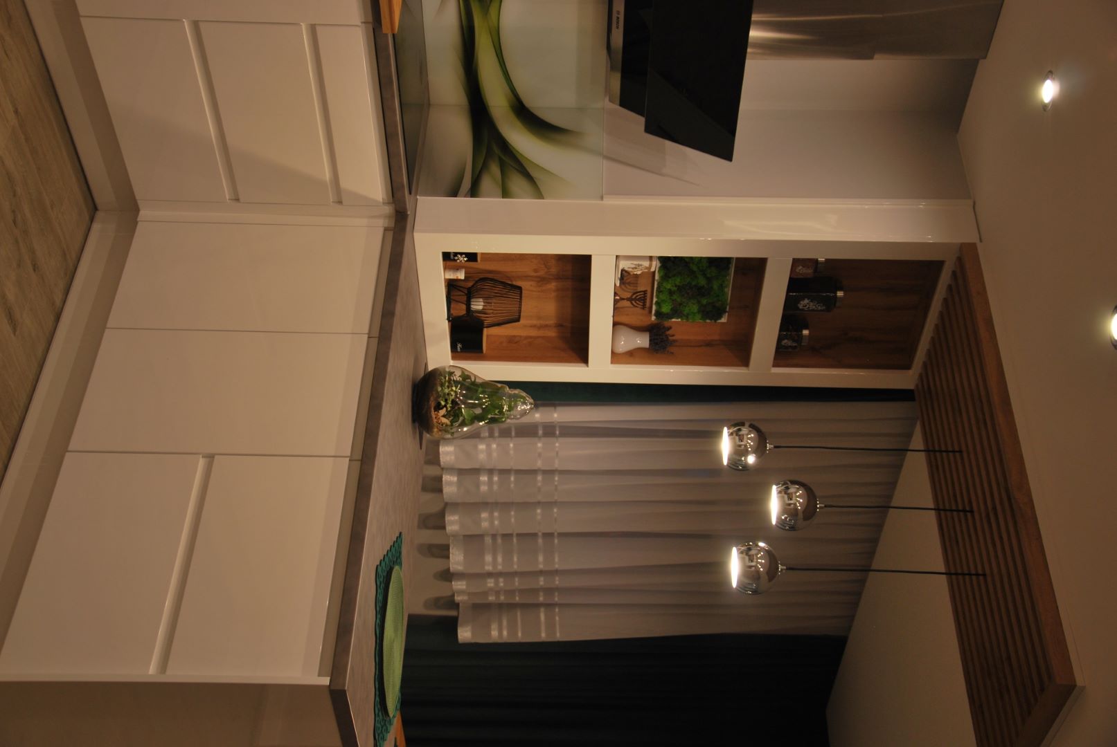 Projekt obejmował część dzienną wraz z kuchnią. Założeniem było, by ograniczyć meble do koniecznego minimum. Tak powstała przytulna i jasna strefa wypoczynkowa wraz z częścią kuchenną i jadalnianą o łagodnym charakterze, odzwierciedlająca upodobania moich klientów. Przyczyniła się do tego przestronna beżowo-drewniana kuchnia i podłogi w kolorze ciepłego drewna. Natomiast charakteru dodała całości pastelowa, szałwiowa ściana oraz stonowana kolorystycznie tapeta z roślinnym wzorem. W części jadalnianej ustawiłam duży stół z midowymi welurowymi krzesłami. W strefie wypoczynku stanęła granatowa, wygodna kanapa. Krzesla i kanapa swoimi barwami nawiązują do magicznej tapety – tworząc bajeczną całość.