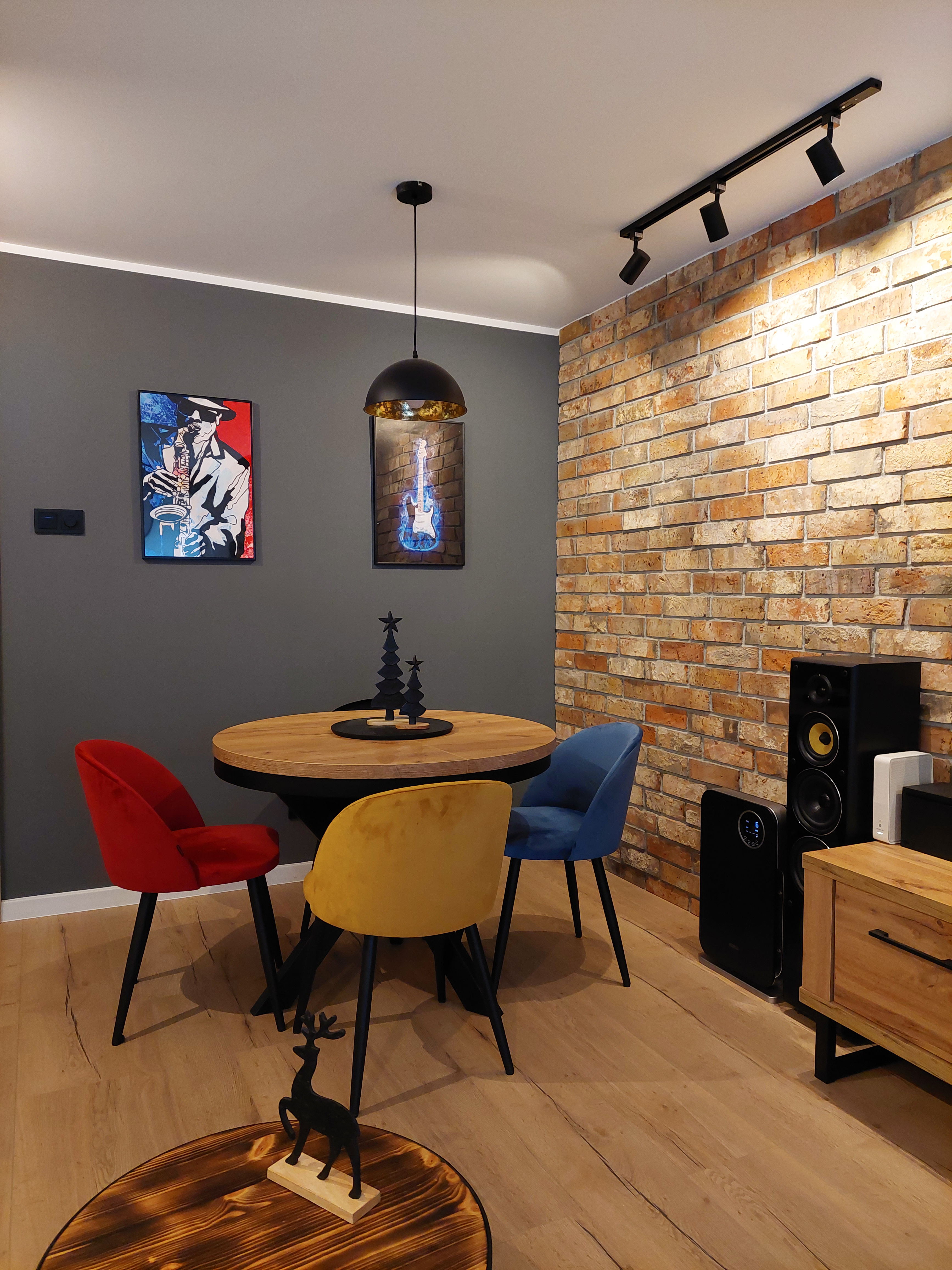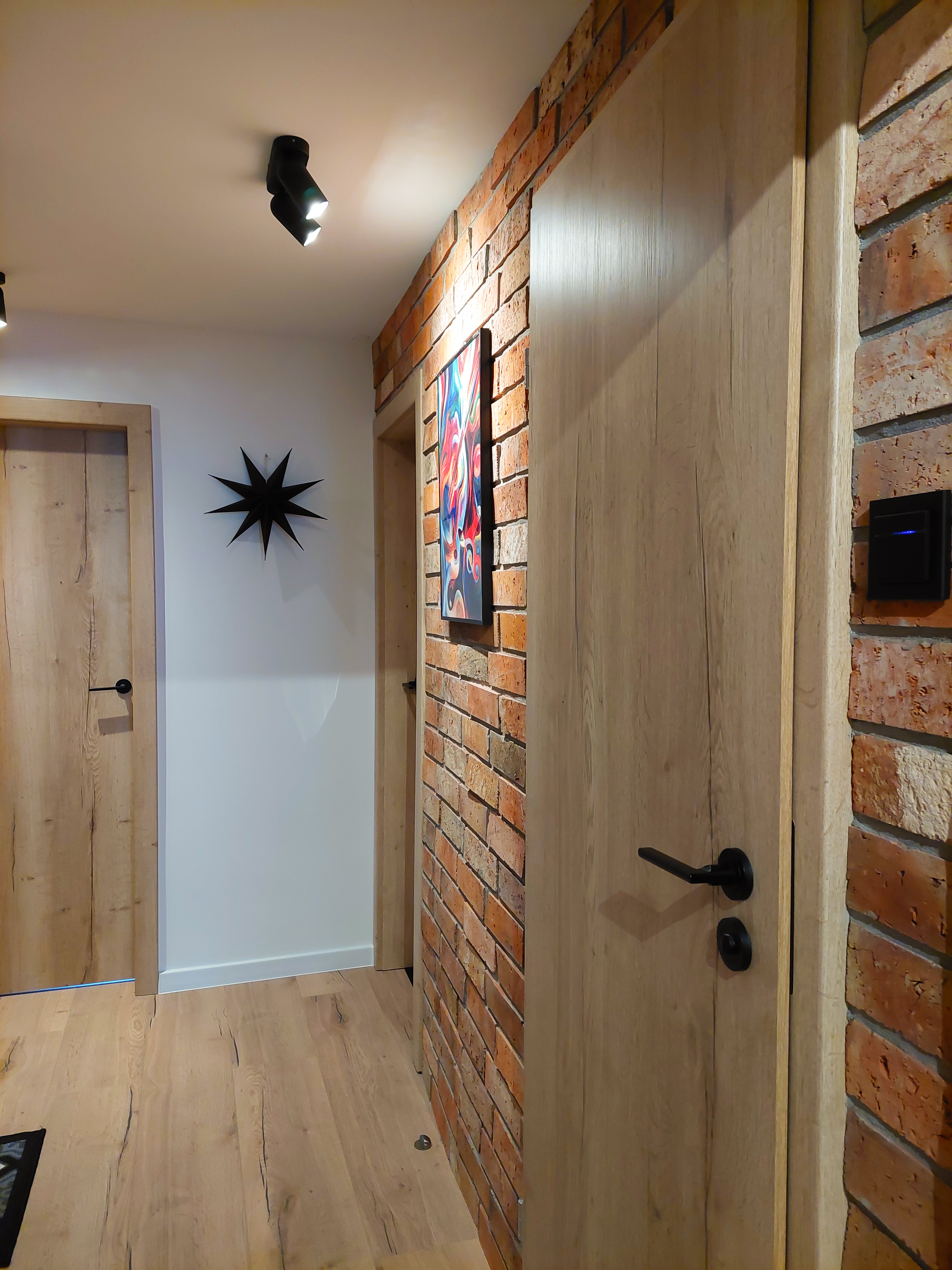Mieszkanie w bloku w stylu loft, gdzie na ścianie króluje naturalna cegła z odzysku, oświetlona czarnymi reflektorami. Energii i ciepła dodają wnętrzu kolorowe krzesła, stół z drewnianym blatem i panele o ciełym dębowym wzorze. Meble z czarnymi stalowymi elementami, stalowy czarny grzejnik i czarne parapety nadają wnętrzu industrialny charakter. Łazienka i sypialnia także są utrzymane w stylu loftowym z drewniamymi meblami i czarnymi dodatkami.