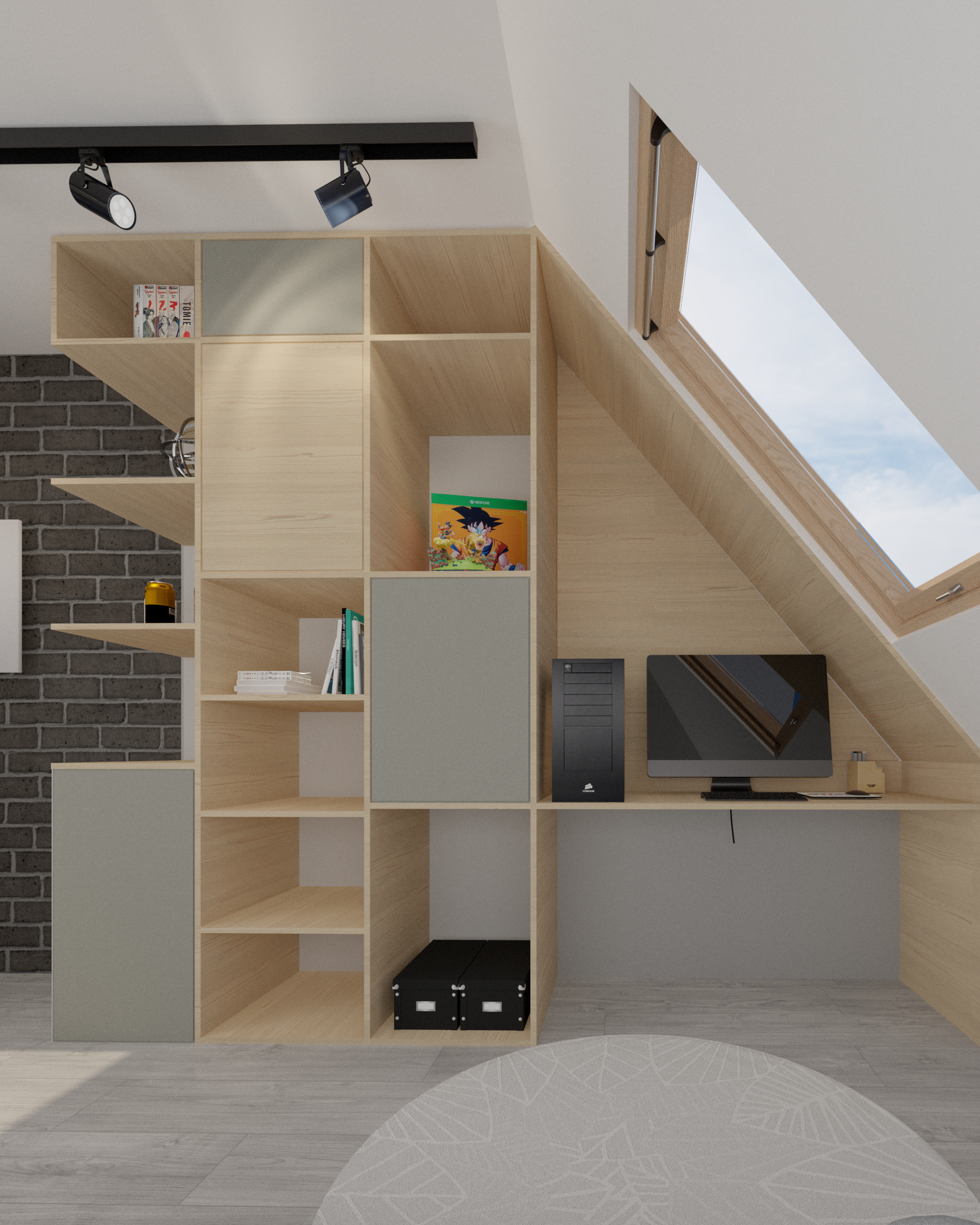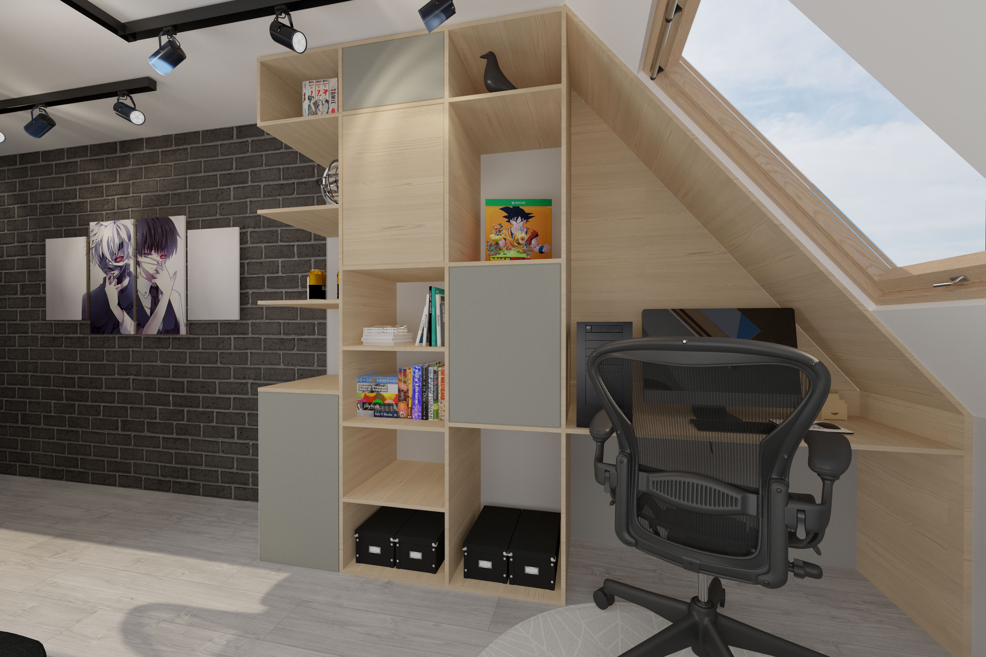 Chciałabym Wam zaprezentować pokój miłośniczki mangi, w którym znalazło się miejsce do pracy w postaci obszernego biurka, otwarte regały przeplatane zamkniętymi szafkami, żeby można było wyeksponować to, co jest to pokazania oraz schować to, co jest przeznaczone tylko dla wtajemniczonych. Meble zostaną wykonane na specjalne zamówienie.